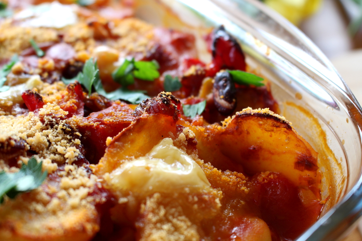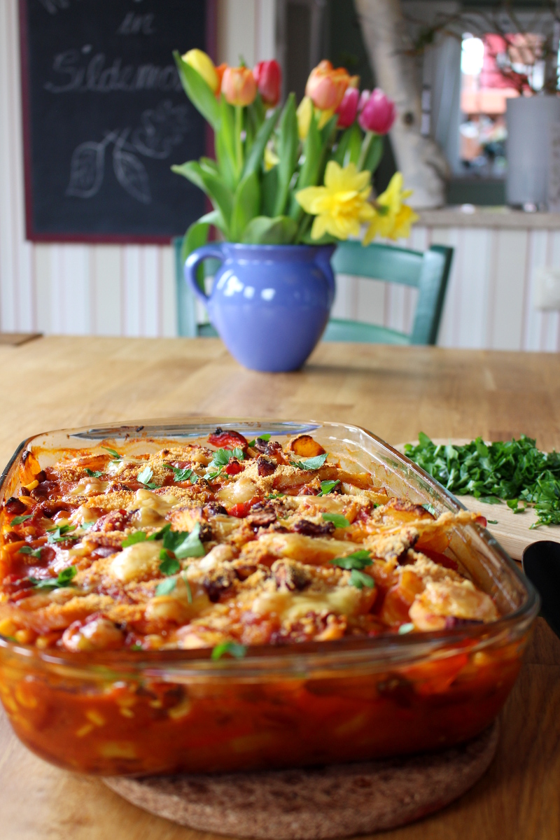 Der Auflauf reicht für 5-6 hungrige Esser und muss nur noch mit reichlich Petersilie bestreut werden. Dann rauf auf den Teller und genießen. Herrlich knusprig, ein bisschen scharf und ein schöner Sattmacher.