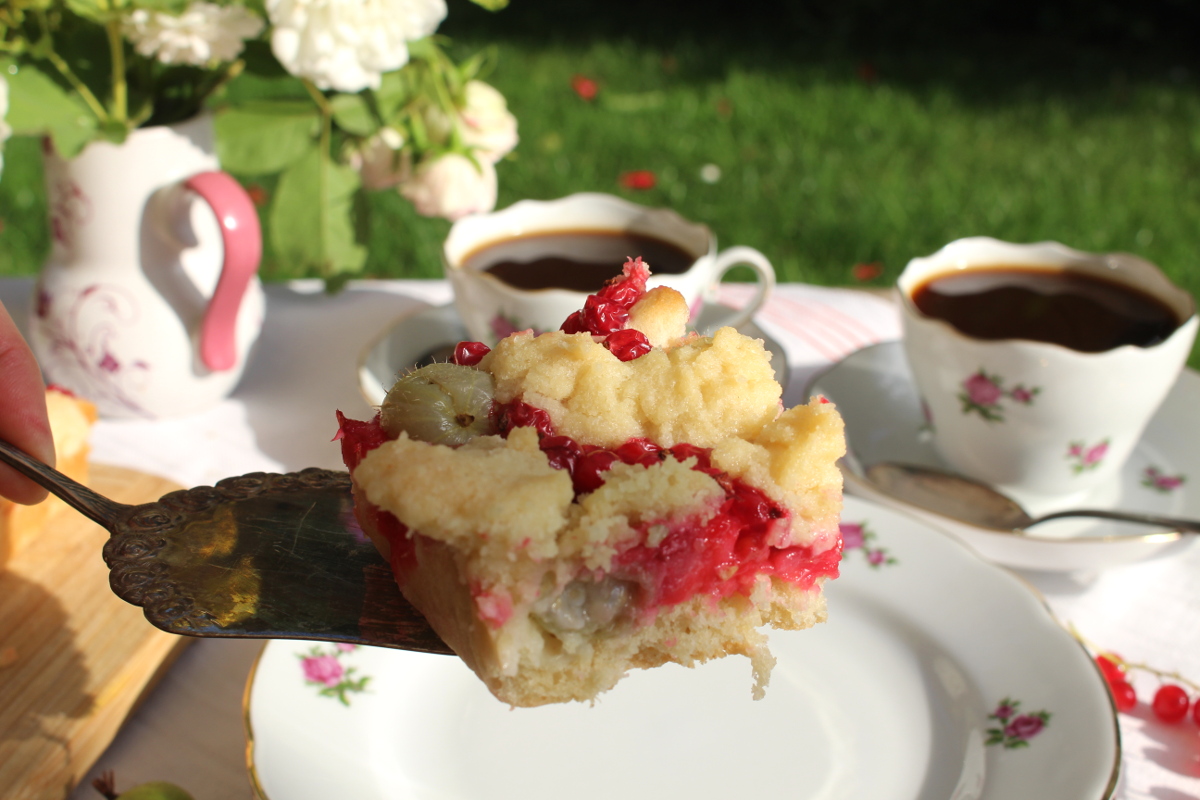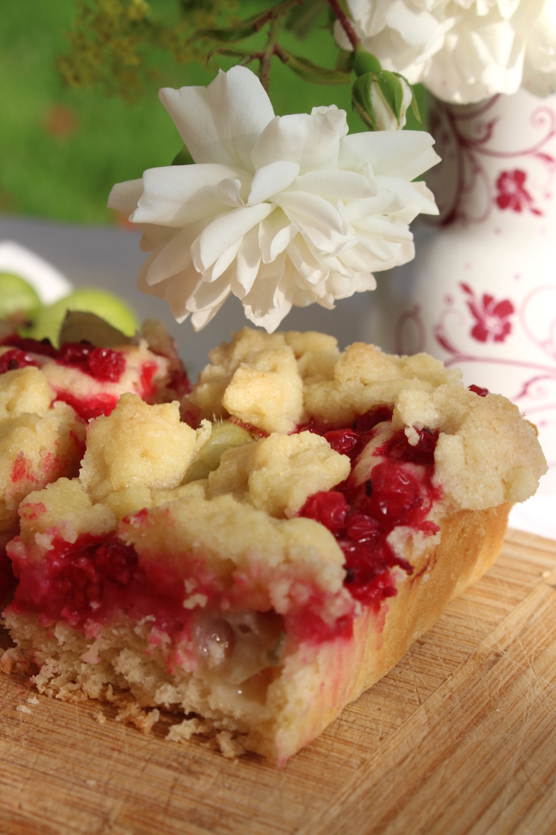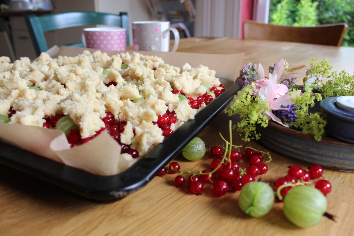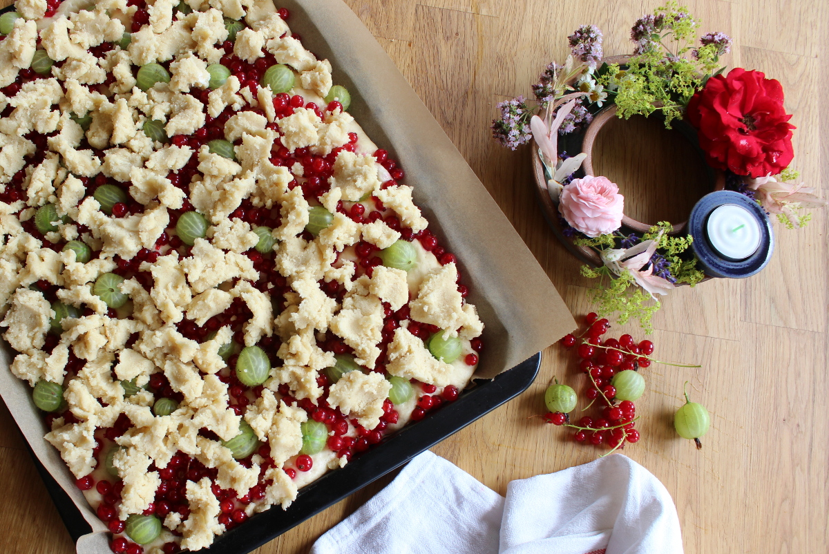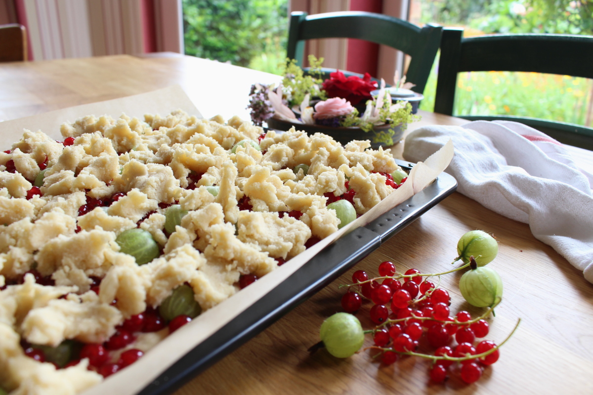 Johannes- und Stachelbeeren geben dem Kuchen ein tolles Aroma. Ich mag einheimisches Obst, dass mit seiner Säure dem Kuchen das gewisse Extra gibt. Wie grandios, dass der eigene Garten oder der der Nachbarin dieses Jahr so viel Beerenobst bereit gehalten hat. Ich kann mir den Kuchen auch sehr gut mit Rhabarber vorstellen, aber auch jetzt so kurz vor der Apfel- und Pflaumensaison mit diesen Obstsorten. Bei süßeren Obstsorten werde ich 50 g Zucker weglassen.