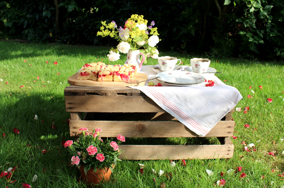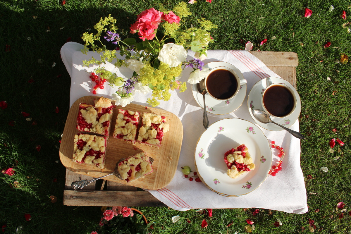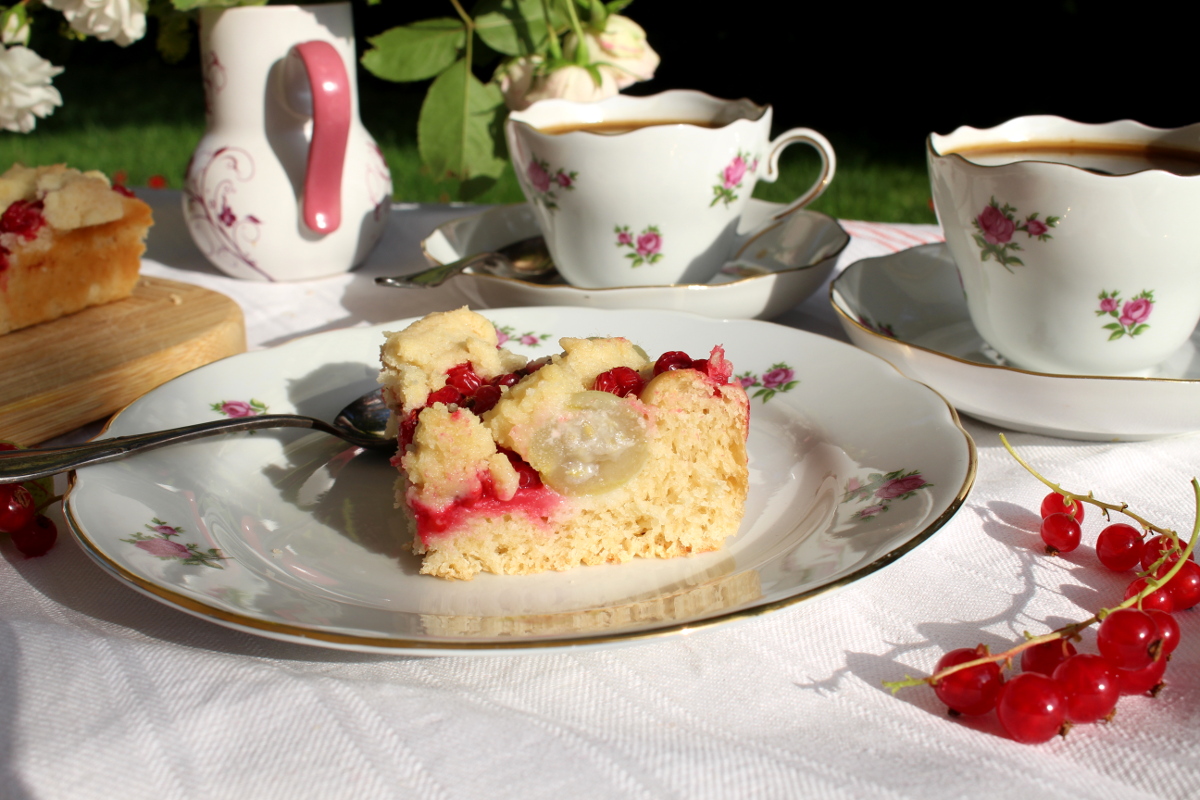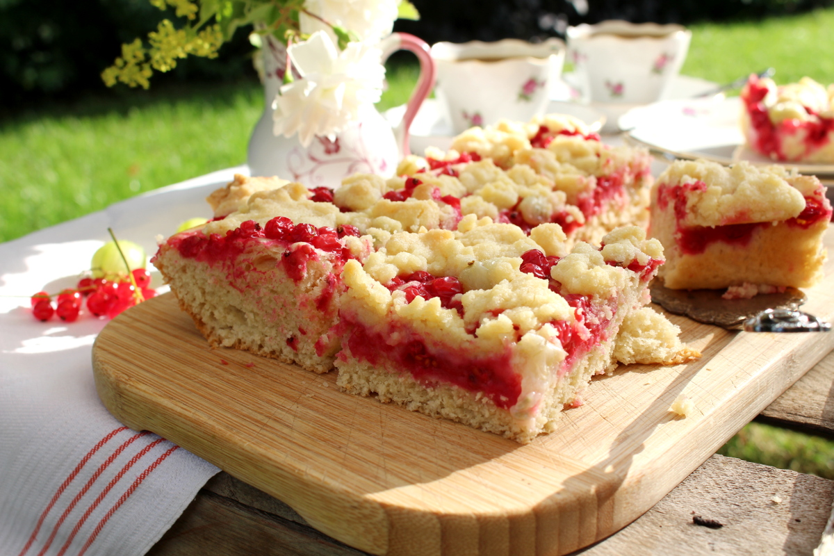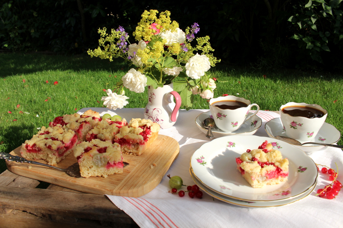 Johannes- und Stachelbeeren geben dem Kuchen ein tolles Aroma. Ich mag einheimisches Obst, dass mit seiner Säure dem Kuchen das gewisse Extra gibt. Wie grandios, dass der eigene Garten oder der der Nachbarin dieses Jahr so viel Beerenobst bereit gehalten hat. Ich kann mir den Kuchen auch sehr gut mit Rhabarber vorstellen, aber auch jetzt so kurz vor der Apfel- und Pflaumensaison mit diesen Obstsorten. Bei süßeren Obstsorten werde ich 50 g Zucker weglassen.