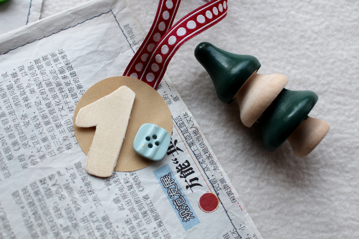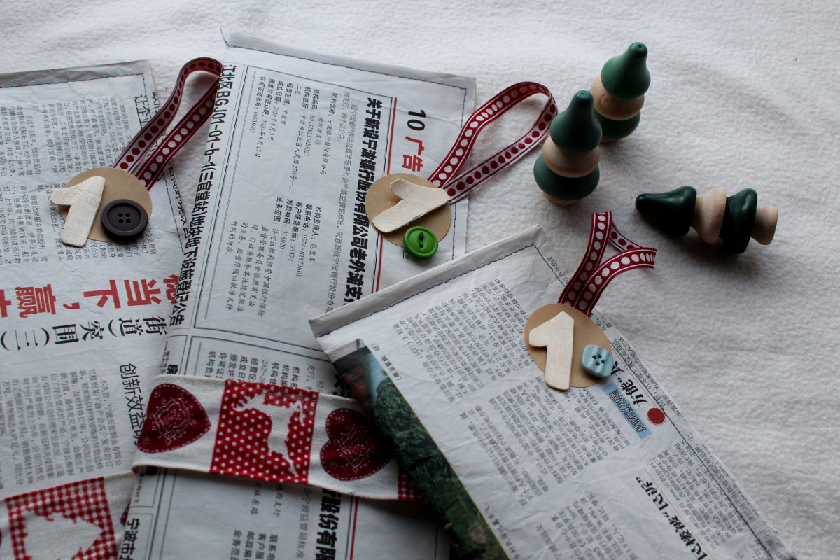 Ich hatte noch ein paar chinesische Zeitungen von einer Lieferung. Der Liebste hatte mich seinerzeit gefragt, ob ich die Verpackung behalten möchte. Er kennt mein Messietum und natürlich wollte ich. Frisch gebügelt kamen sie jetzt zu ihrer Bestimmung. Fisch in Zeitung eingewickelt ist doch ein Klassiker, oder? Ich nähte die Sprottenmäppchen ein, schnitt aus einem kleinen Spankörbchen meine Nummer 1 für den ersten Adventssonntag aus und klebte sie mit einem Bändchen an die Päckchen. Ein Streifen wirklich uraltem Geschenkbandes – hinten zusammengenäht – wurde als Banderole um die Päckchen gewickelt. Fertig war das verpackte Mäppchen und konnte sich auf die Reise machen.
