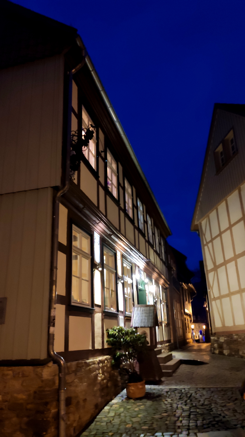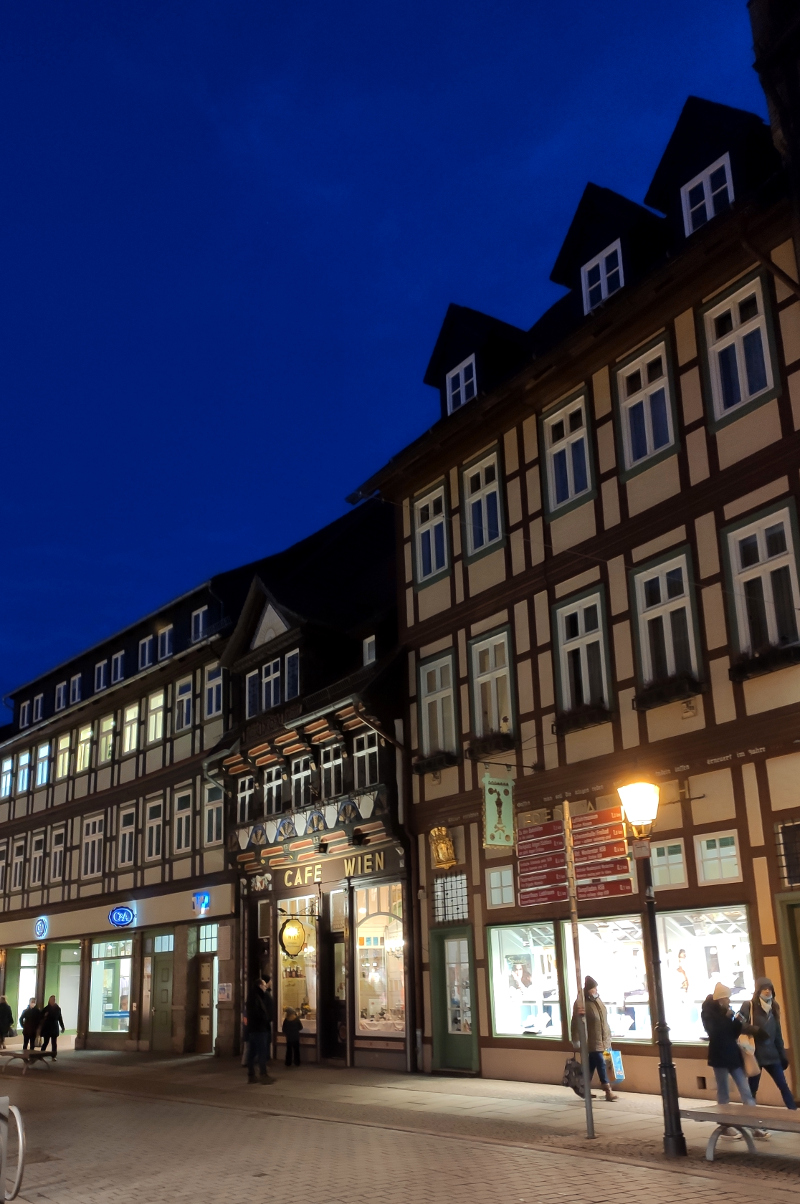 Im Februar ist es erfahrungsgemäß recht früh dunkel. Macht nichts in der Fachwerkstadt Wernigerode. Ein Abendspaziergang zeigt ebenso den Charme des kleinen Städchens. Die angestrahlten Toreingänge und Fachwerkhäuser sind zur blauen Stunde wunderschön anzusehen.