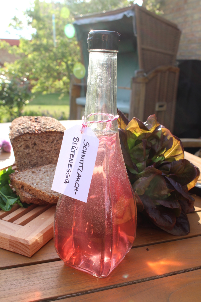Hier noch einmal der Essig in seiner pinken Pracht. Eine Vollkornbrotstulle mit der würzigen Schnittlauchblütenbutter ist echt der Hammer und die Männer in der Familie nickten anerkennend nach dem ersten Bissen. Echte Frühlingsküche! Na, wäre das auch etwas für dich?