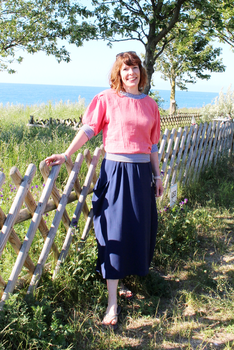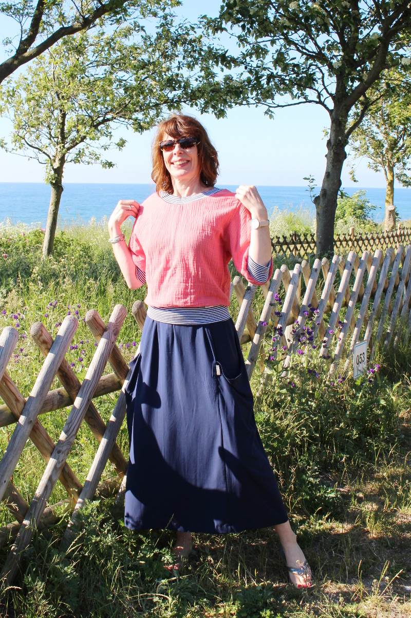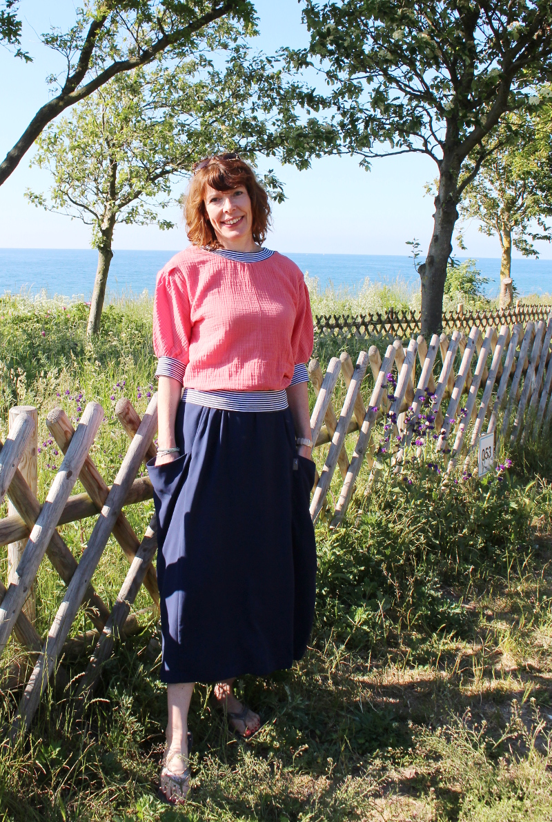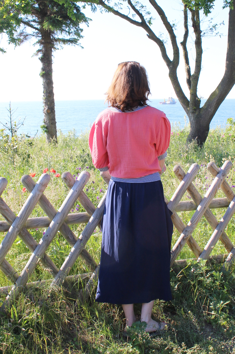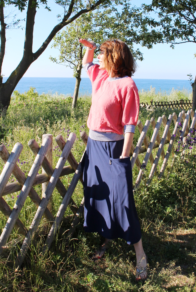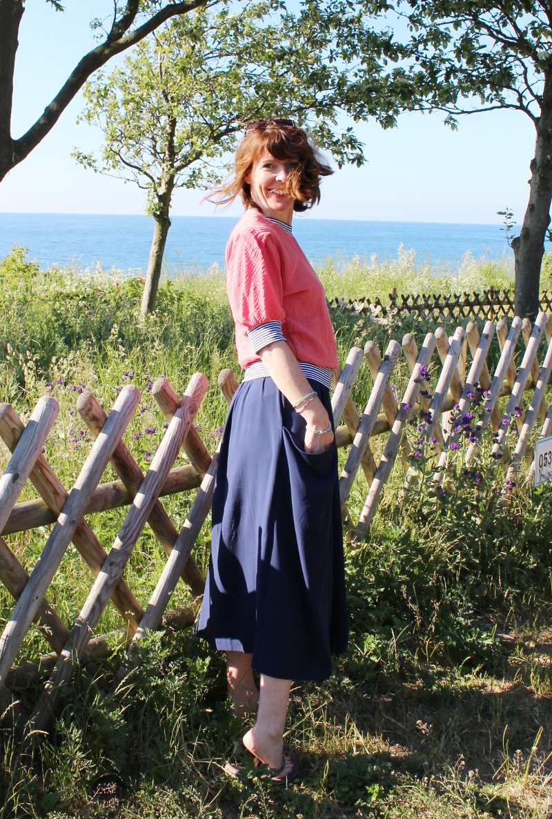 Dazu habe ich mir eine Arielle von Fibremood genäht. Ich bin echt großer Fan von der Nähzeitschrift, die raffinierte und doch relativ einfache Schnitte zum Nähen enthält. Ich entschied mich hier für einen gemütlichen, korallefarbenen Musselinstoff, den ich mit einem blau-weißen Ringelbündchen kombiniert habe. Das Oberteil passt farblich so perfekt zu dem maritimen Rock und war ein toller Begleiter an der Küste.