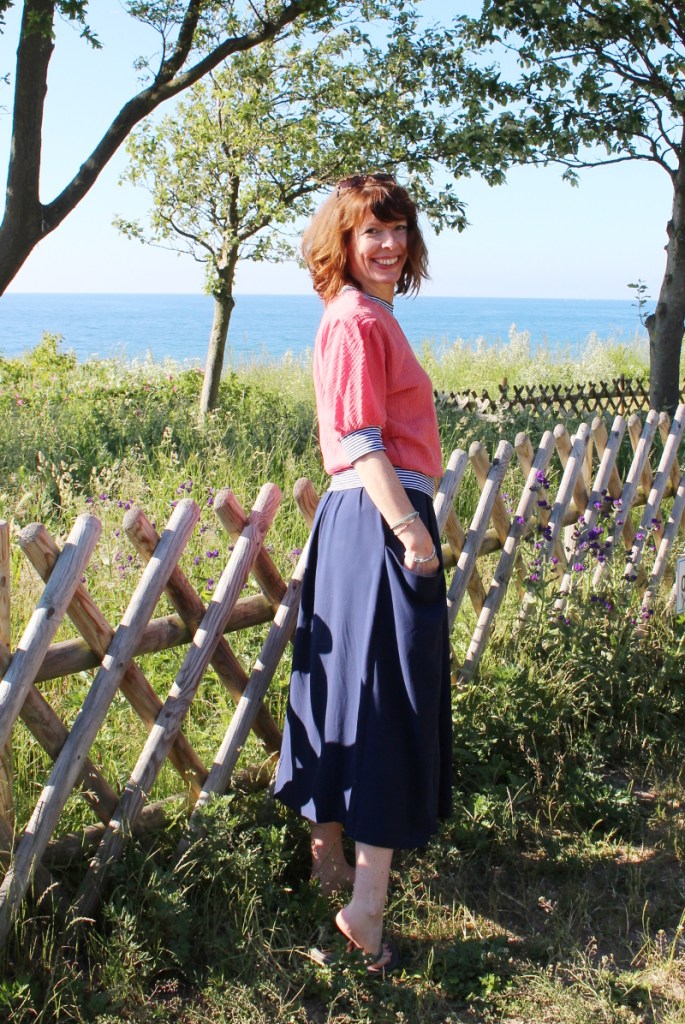 Wie du siehst, fühle ich mich pudelwohl in meinem Outfit und es wird an etwas frischeren Sommertagen bestimmt gern getragen. Ich liebäugle noch mit einem rot-weißen Streifenshirt zu dem Rock. Das könnte doch die nächste Variation in meiner Garderobe werden, oder?