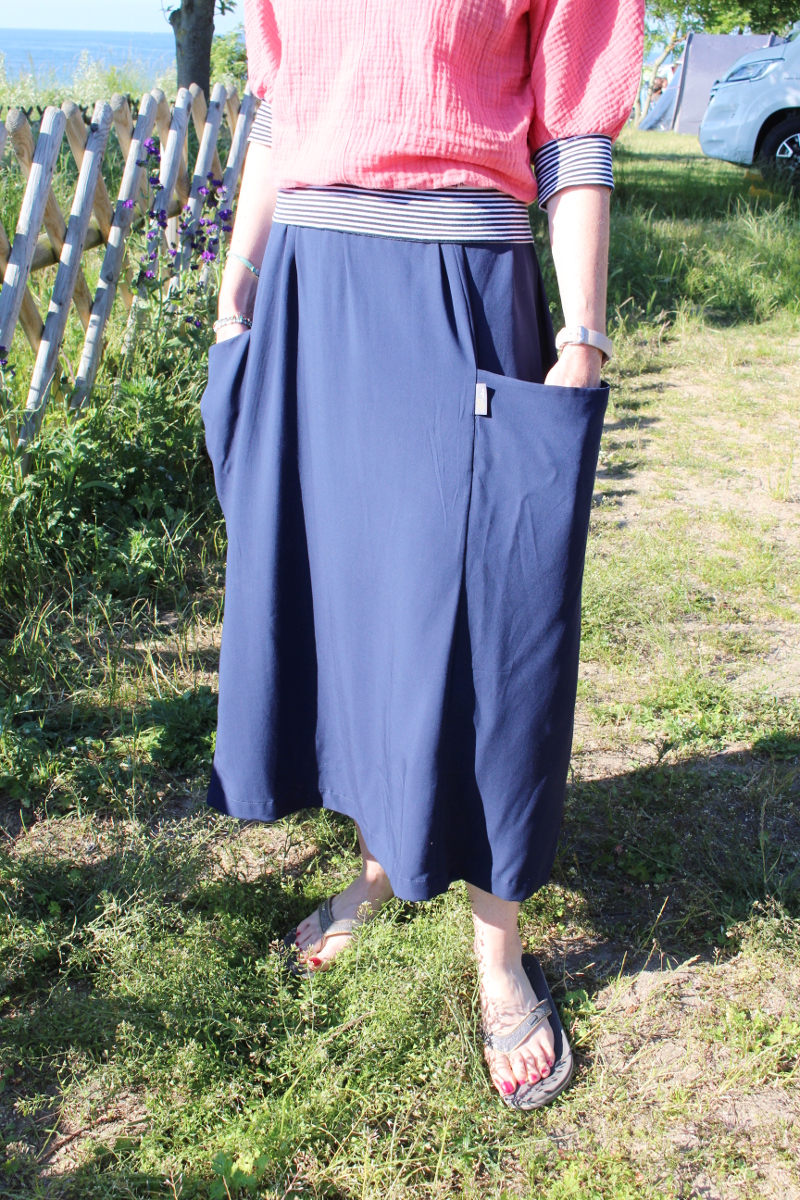 Eine kleine Kontrolle im übersichtlichen Stash und eine etwas schwerere Viskose im geliebten Blau wurde dafür auserwählt. Das Schnittmuster, übrigens kostenlos, ist einfach und raffiniert. Die riesengroßen Taschen sind perfekt für Schlüssel, Handy, Taschentücher und sonstiges Gedöns. Mit Gummizug war der bequeme Rock schnell genäht und ich kann schon jetzt verraten, dass er zu einem Lieblingsteil avancieren wird.