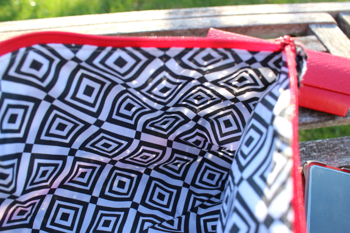 Für die Fertigstellung der Taschenhülle habe ich zunächst ein passendes Inlet genäht, dann einen roten Reißverschluss an das Futter angenäht und diesen anschließend per Hand in das Häkelwerk eingenäht. Grundsätzlich bin ich ja nicht so der Fan von Handnäharbeiten, aber ich wollte das gern fertig haben und es war auch wirklich einfach. Ich habe mit schwarzem Nähgarn von außen immer nur die Häkelmaschen und den Reißverschluss mit der Nähnadel erfasst. So sieht man von der Futterseite aus keine Handstiche und es sieht von innen und von außen perfekt aus, da die Häkelmaschen das schwarze Nähgarn praktisch unsichtbar machen. Mal richtig gut gelungen und das behaupte ich mit meinem selbstkritischen Blick nicht oft.