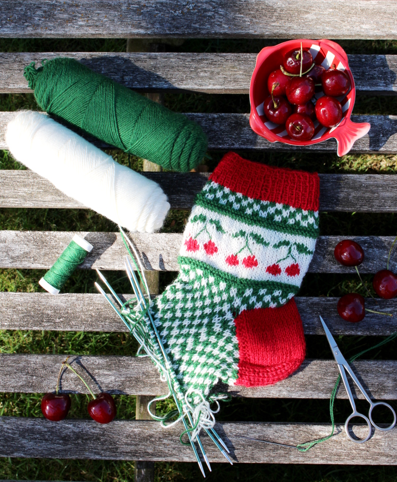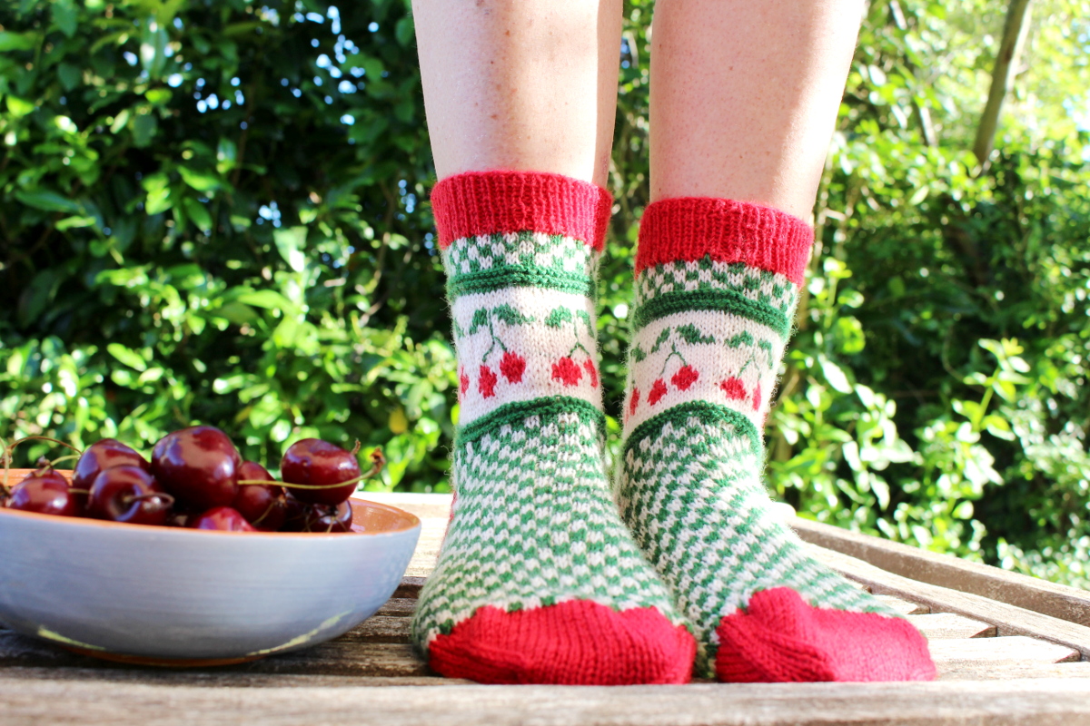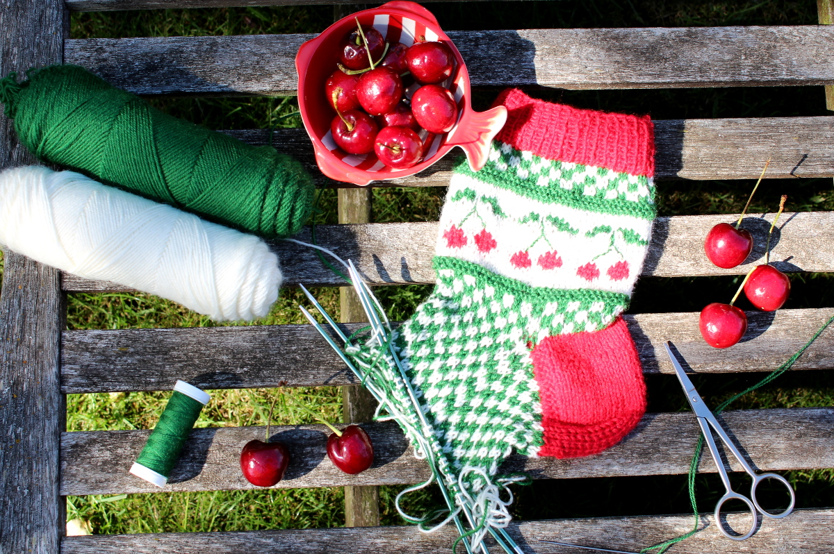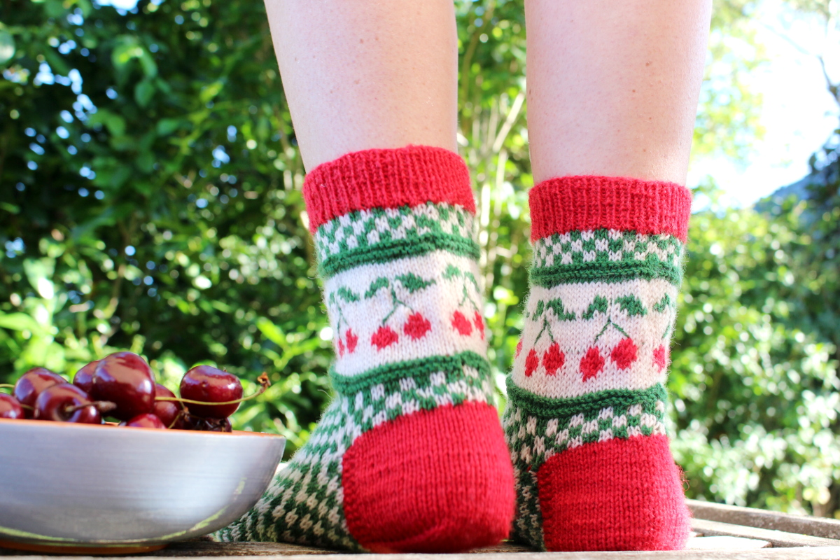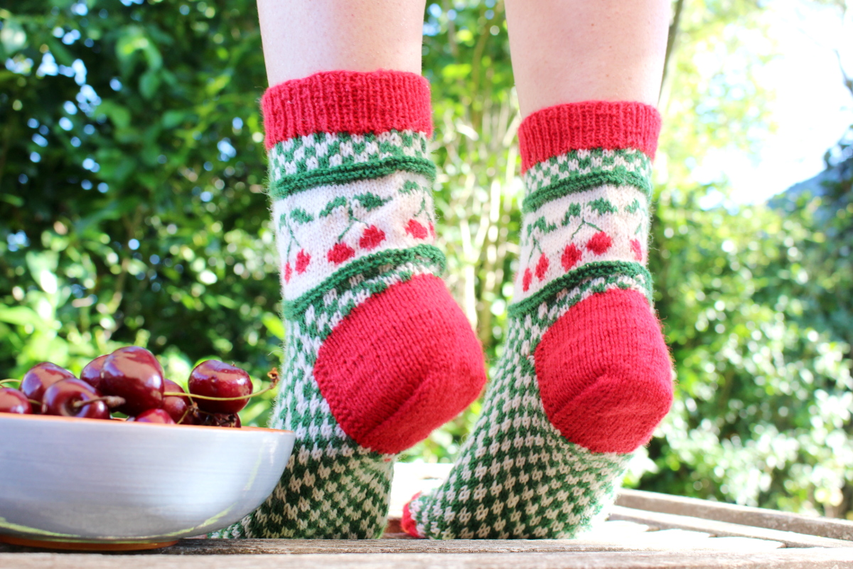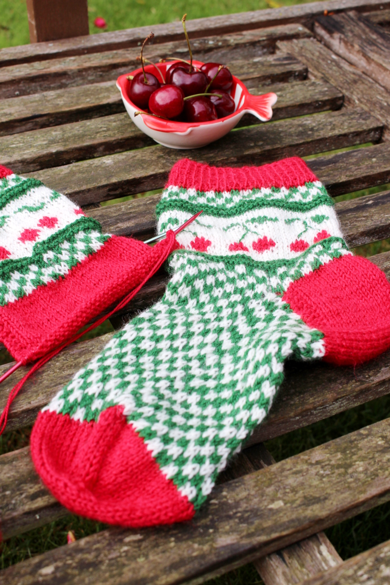 Auch wenn jetzt im Hochsommer nicht gerade Sockenwetter ist, freue ich mich über meine Merino-Exemplare. Im Winter freut man sich auf jeden Fall über ein paar Kirschsocken und man denkt bestimmt an die schöne Zeit, in der sie entstanden sind.
