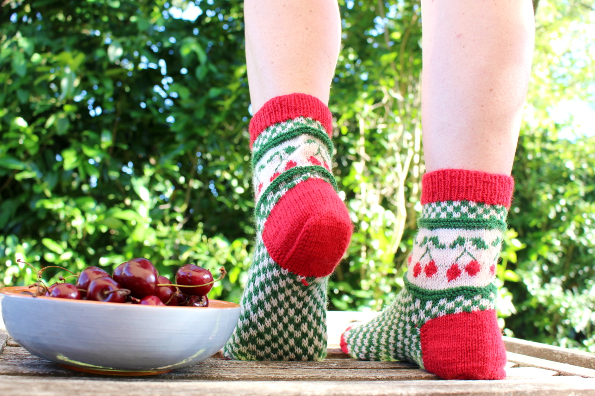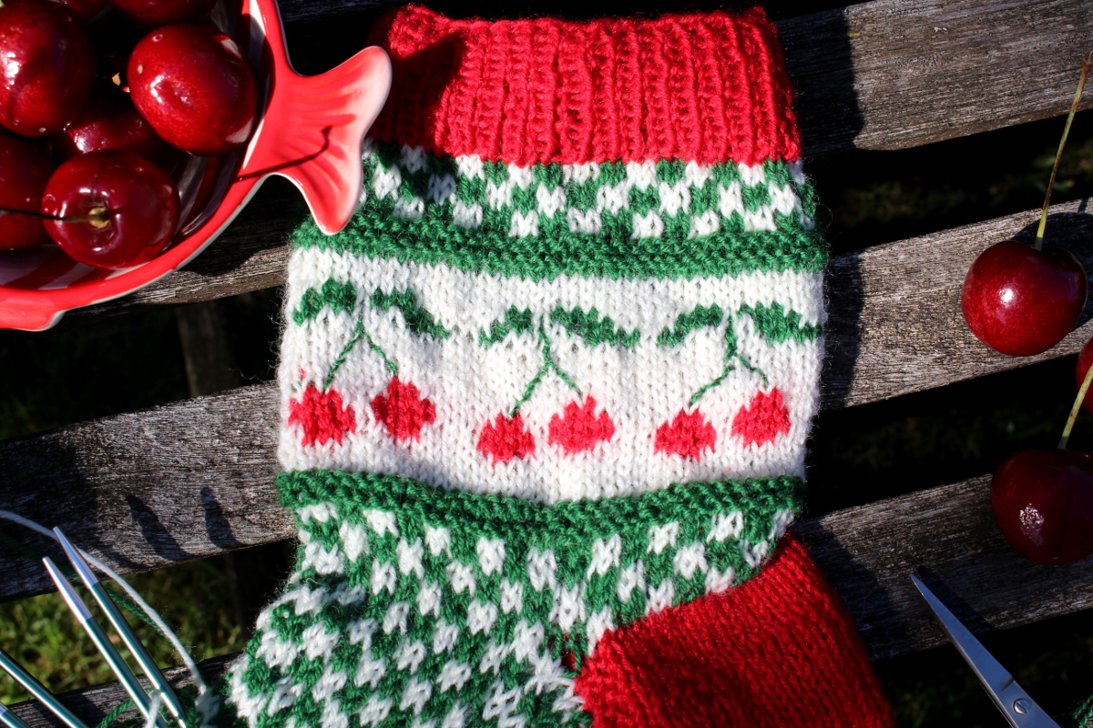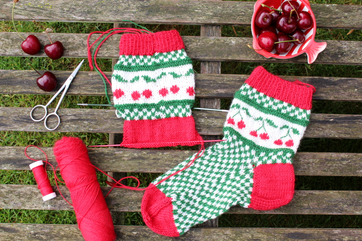 Als Susanne von https://www.instagram.com/lenyaduluoz/ fragte, ob nicht jemand mit ihr Socken stricken möchte, konnte ich nicht widerstehen. Die Socken enthielten ein sommerliches Kirschmotiv und ich hatte große Lust auch solche Kirschsocken zu stricken. Also geschwind den Wollladen gestürmt und ein paar Knäul Sockenwolle erworben. Dann konnte es auch schon losgehen. Da ich nicht ganz so bewandert im Sockenstricken bin, schreibe ich ein paar von meinen Erfahrungen auf. Vielleicht sind sie dem einen oder anderen auch ganz nützlich.
