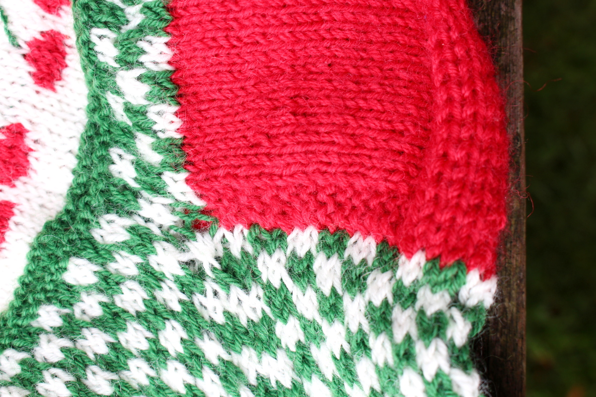 - Dann in Grün und Weiß im kleinen Schachbrettmuster (2 grün, 2 weiß und nach 2 Reihen im Wechsel) über 6 Reihen. Ich habe dafür den einen Faden klassisch über den Finger gelegt und den anderen genau anders herum. Ich habe das auf Instagram in einem Reel gezeigt. Den Tipp habe ich von Etu bekommen und es hat super geklappt. Sobald man Intarsien strickt, sollte man auf mindestens eine Nadelstärke größer wechseln.