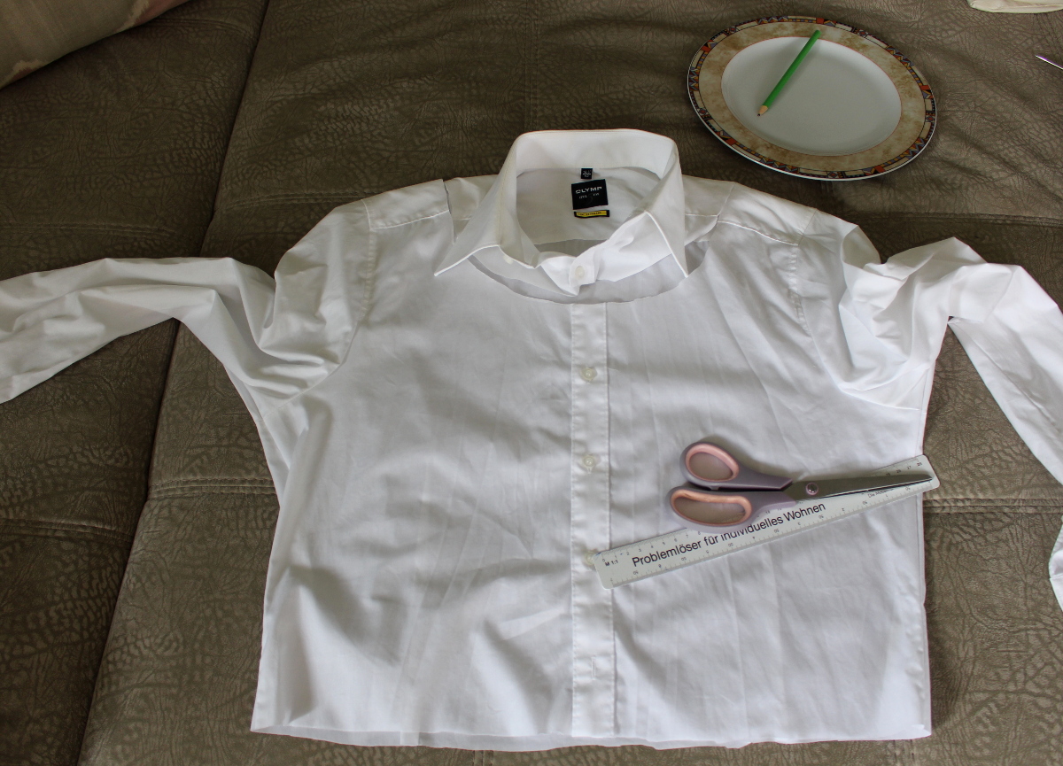 Für den Halsauschnitt habe ich mit Hilfe eines Tellers (Durchmesser 28 cm) den Kragen vorn und hinten abgeschnitten. Vorn fungiert der halbe Teller als Schnittmuster. Du kannst auch eine Pappe in der Größe zuschneiden. Unten habe ich das Hemd bei ca. 29 cm Knopfleistenlänge abgeschnitten. Man muss darauf achten, wo die Knöpfe liegen. Wenn das Rockteil annäht wird, darf kein Knopf im Weg sein.