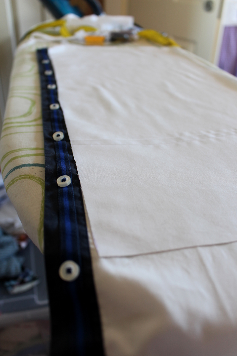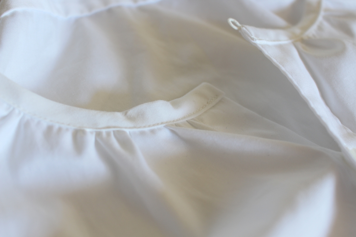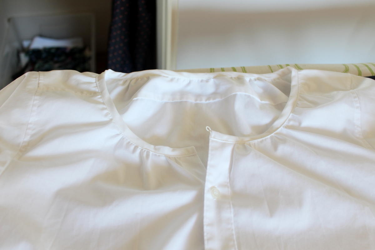 Den Ausschnitt habe ich gekräuselt und mit Schrägband aus dem Ärmel eingefasst. Oben rechts habe ich noch eine weiße Gummischlaufe miteinfasst. Mit einem kleinen Knöpfchen (leider noch nicht auf dem Foto) kann man die Knopfleiste dann komplett schließen.