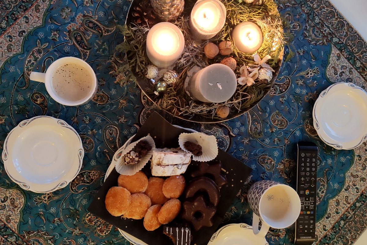 Was kommt nach dem Mittagsschlaf? Na klar, ein Kaffee! Kekse, Lebkuchen, Stollen – alles da und bei einer Folge Big Bang Theory wurde gemütlich geknabbert. Danach ging es weiter mit dem Weihnachtsprojekt. Nach dem Papierkrieg wurde zugeschnitten.