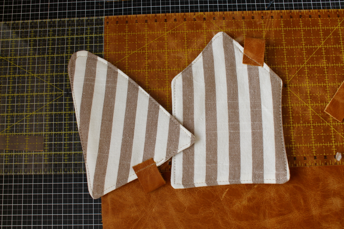 Außen angenäht sah das nicht so toll aus und der Nähfuß hinterließ Spuren auf dem Leder. Nächster Versuch war das Verbinden mit Nieten. Leider hatte ich nicht die richtigen zu Hause und sie hielten nicht einmal bei dünnerem Kunstleder. Dann steckte ich die Lederstreifen in die Wendeöffnung und schloß diese mit einer Geradenaht und das war die beste Variante. Da ich die Stoffmuster gern für sich wirken lassen wollte, steppte ich die Untersetzer nicht mehr mit dem typischen Nikolaushaus und Tannenbaummuster ab. Hier noch einmal alle Untersetzer im Überblick.