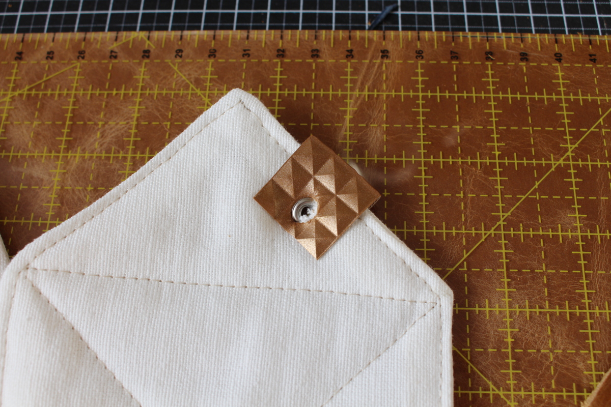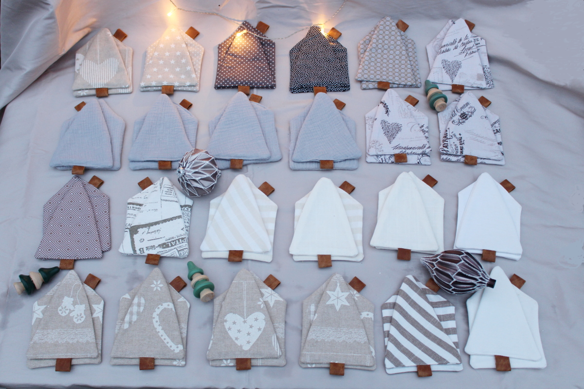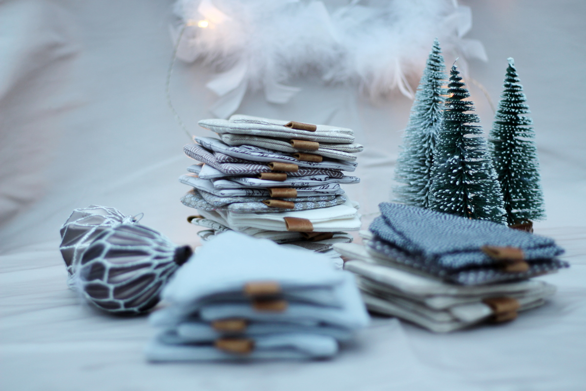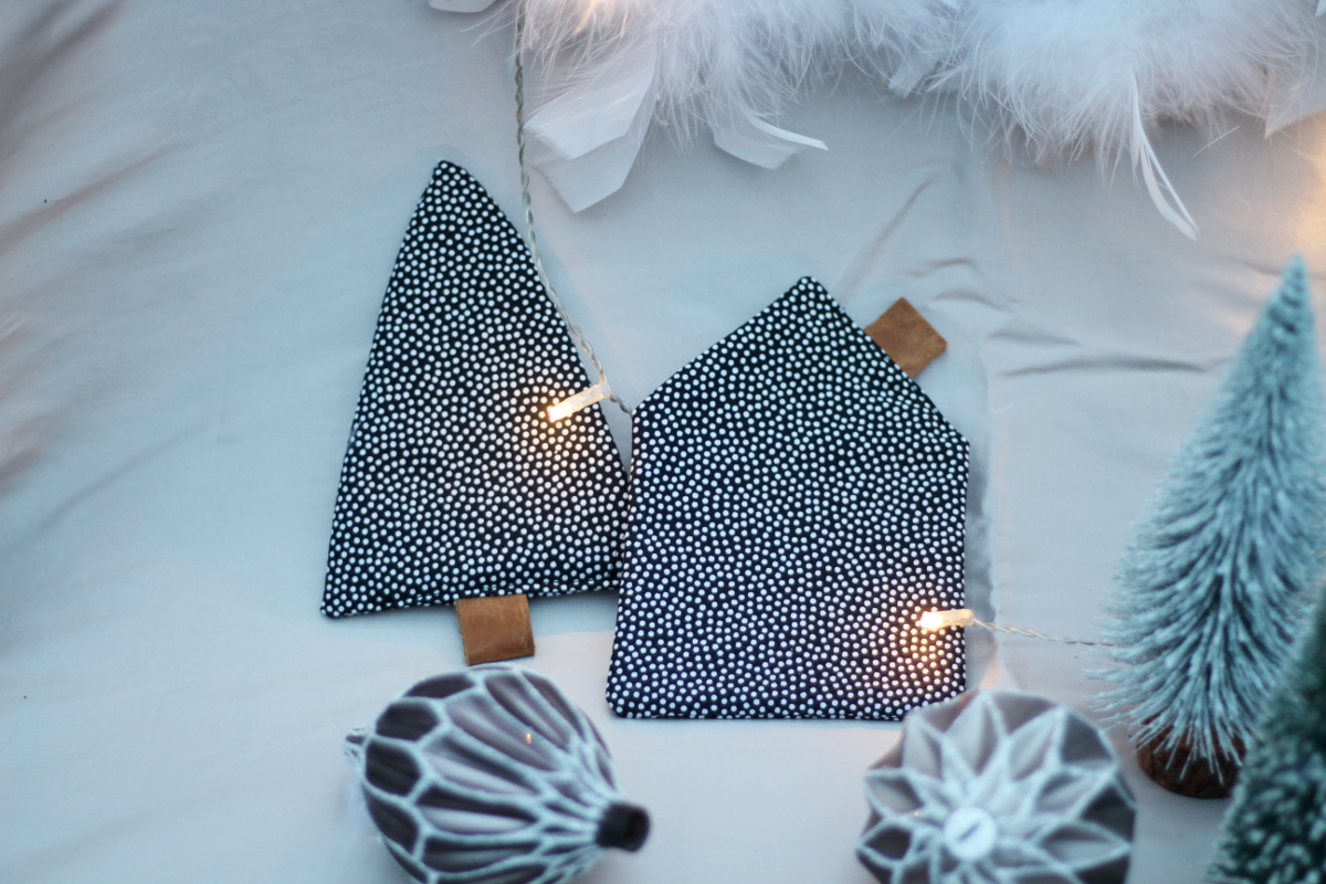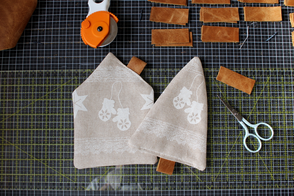 Ich habe verschiedene Baumwollstoffe mit einer Lage Vlieseline H630 vernäht und so entstanden 24 Häuschen und 24 Bäumchen. Für den Kamin am Häuschen und den Baumstamm an der Tanne wollte ich braune Lederreste verwenden. Mit Trial and Error fand ich die bestmögliche Variante diese anzubringen.