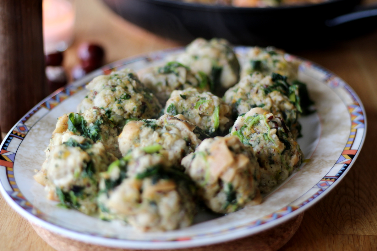 Dieses Jahr möchte ich wieder mehr Gaumenfreuden hier zeigen und so gibt es heute hier Spinatknödel mit Pilz-Zucchini-Pfanne in einer veganen Variante. Gerade bei den Knödeln war es sehr einfach, auf tierische Bestandteile zu verzichten, ohne dass es mit einem Geschmacksverlust einher ging. Gemüsepfannen gehen sowieso immer in vegan und so kredenze ich euch heute diese Tiroler Spezialität, die auch einen Hauch Italien verbreitet angesichts der Zutaten.