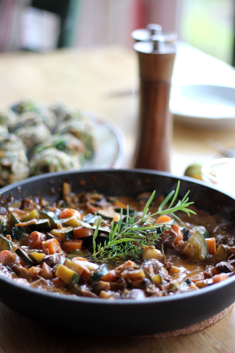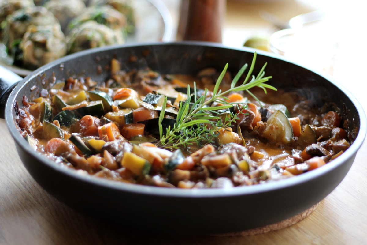 So, es ist angerichtet und auch wenn das Essen keinen Schönheitspreis gewinnen wird, ist es Soulfood für Herbst und Winter. Mit den mediterranen Gewürzen hat es einen Hauch südlicher Lebensart, die Knödel sind aus der österreichischen Küche entlehnt. Damit ist es eine leckere Kombi, wie sie auch typisch für Südtirol sein könnte. Dort gab es in den Restaurants auch auf den Speisekarten sehr oft Knödel und Pizza. Hier trifft die mediterrane Gemüsepfanne auf fluffig, leichte Spinatknödel. Ich denke, jetzt, wo ich das Rezept „ordentlich“ aufgeschrieben haben, könnte ich es demnächst wieder einmal zubereiten. Vielleicht hast du ja auch Lust auf diese vegane Köstlichkeit.