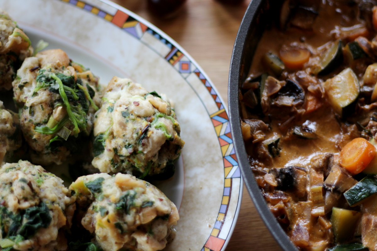 Spinatknödel mit Pilz-Zucchini-Pfanne – vegan