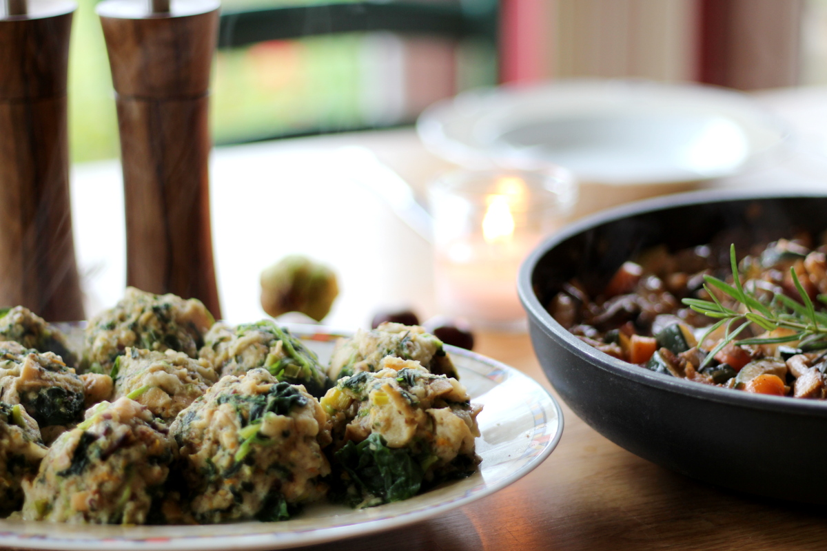 Spinatknödel mit Pilz-Zucchini-Pfanne – vegan
