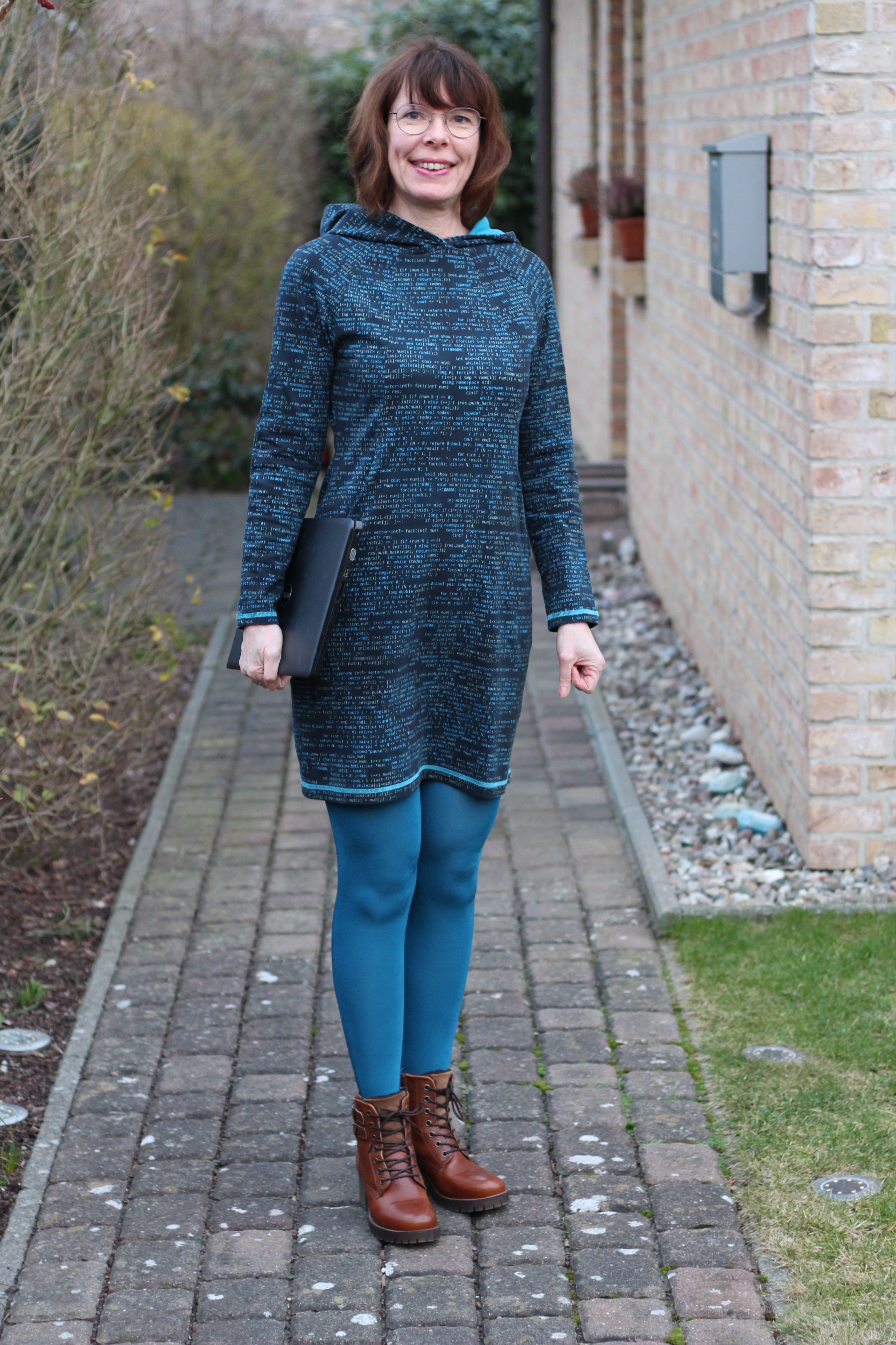 Das Besondere an dem Schnitt sind die Taschen, die in die Teilungsnähte miteingearbeitet sind. Da hat sich Ina von Pattydoo richtig was Tolles einfallen lassen. Ich habe hinten an der Kapuze noch ein Label angebracht. Ja, ich gebe zu, das war eher aus Verlegenheit, da ich dort ein kleines Löchlein produziert hatte, aber jetzt finde ich es ganz witzig, zumal ich das Label zentral plazieren konnte. Good vibes brauche ich immer, ob privat oder im Job. Jetzt sagt doch noch was zu der passenden Strumpfhose. Ob ihr es glaubt oder nicht, die hatte ich bereits schon seit ewigen Zeiten im Schrank. Jetzt hat sie ihren regelmäßigen Auftritt mit dem Kleid. Hach, manchmal läuft es einfach.