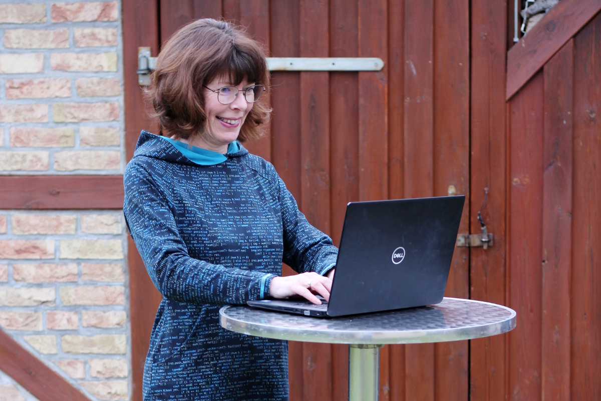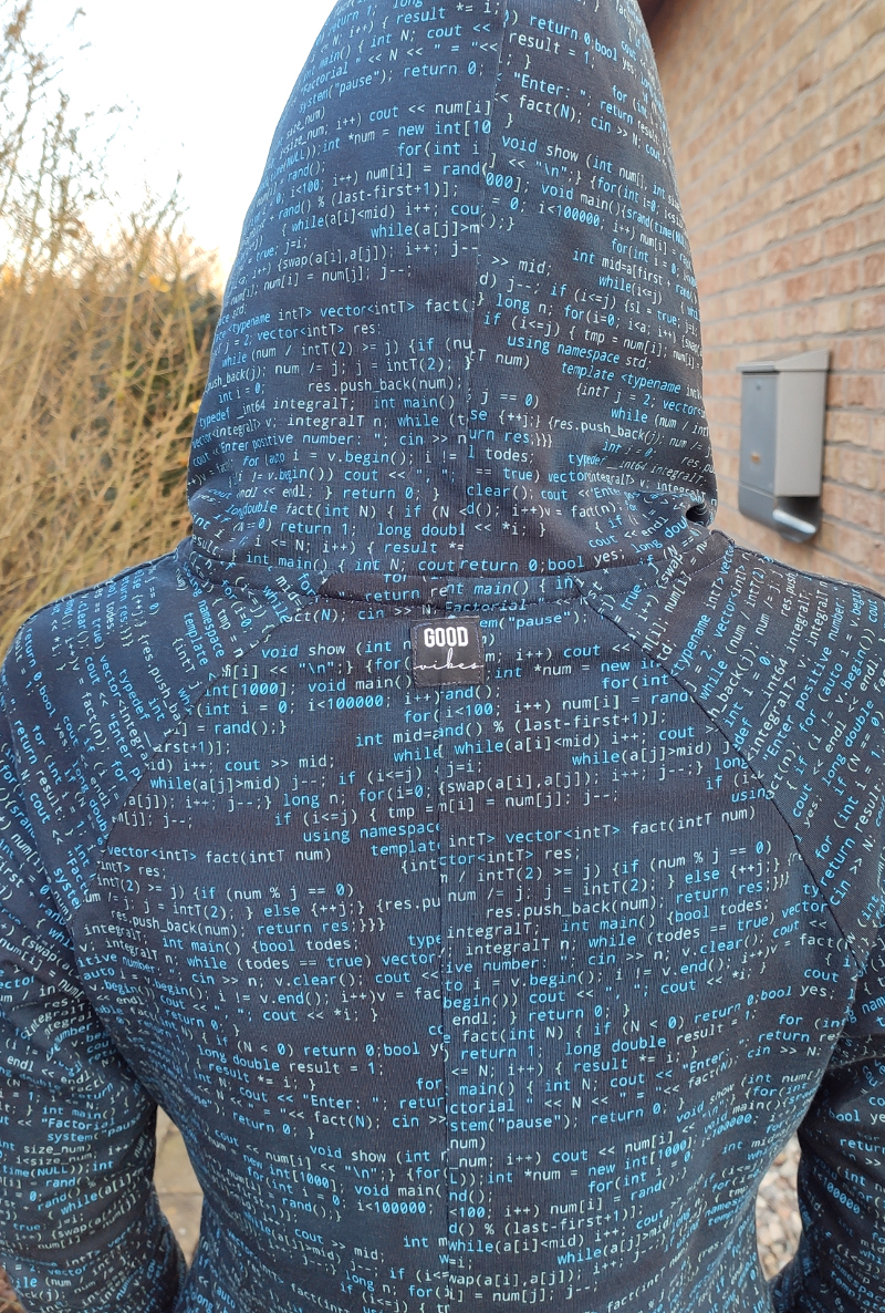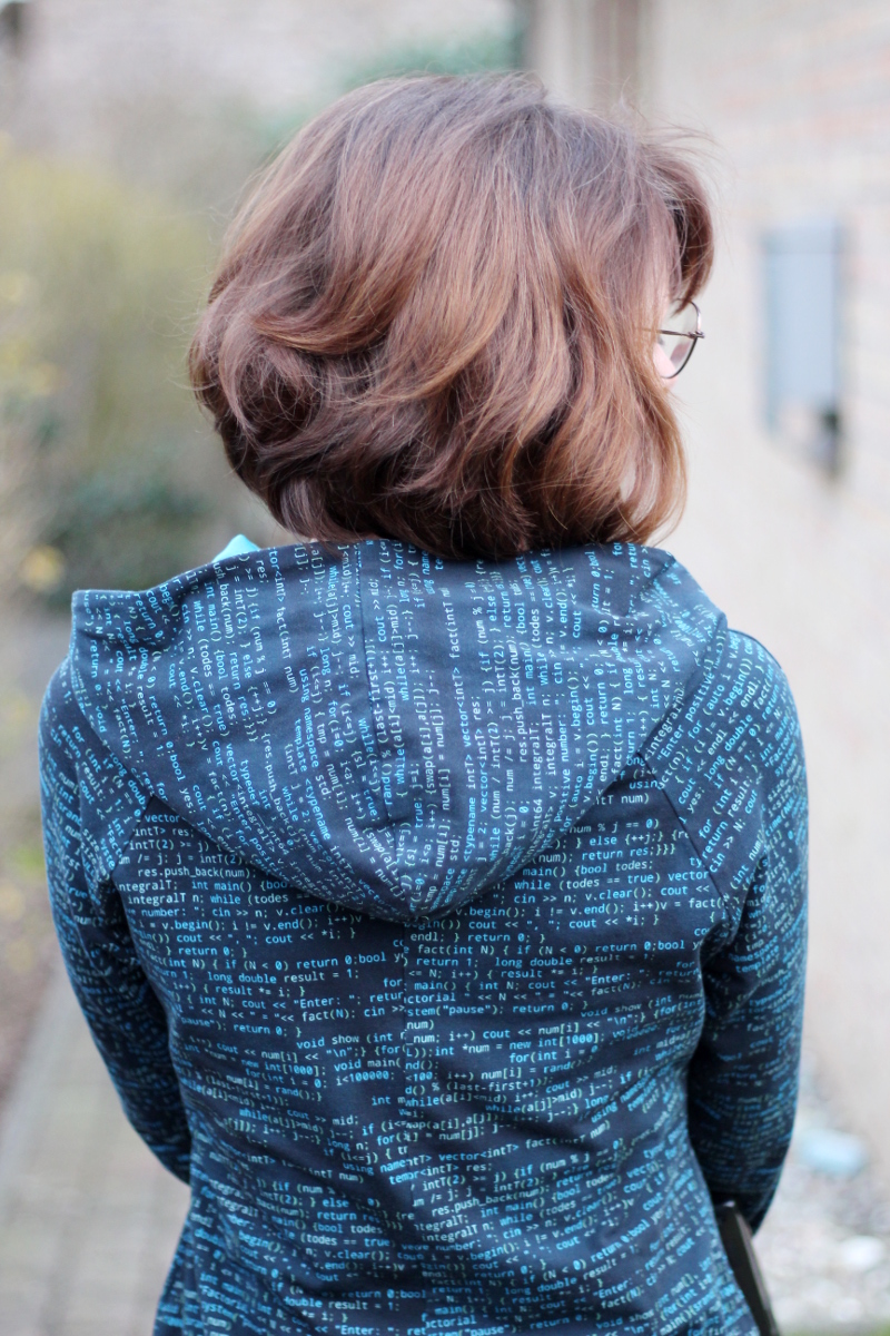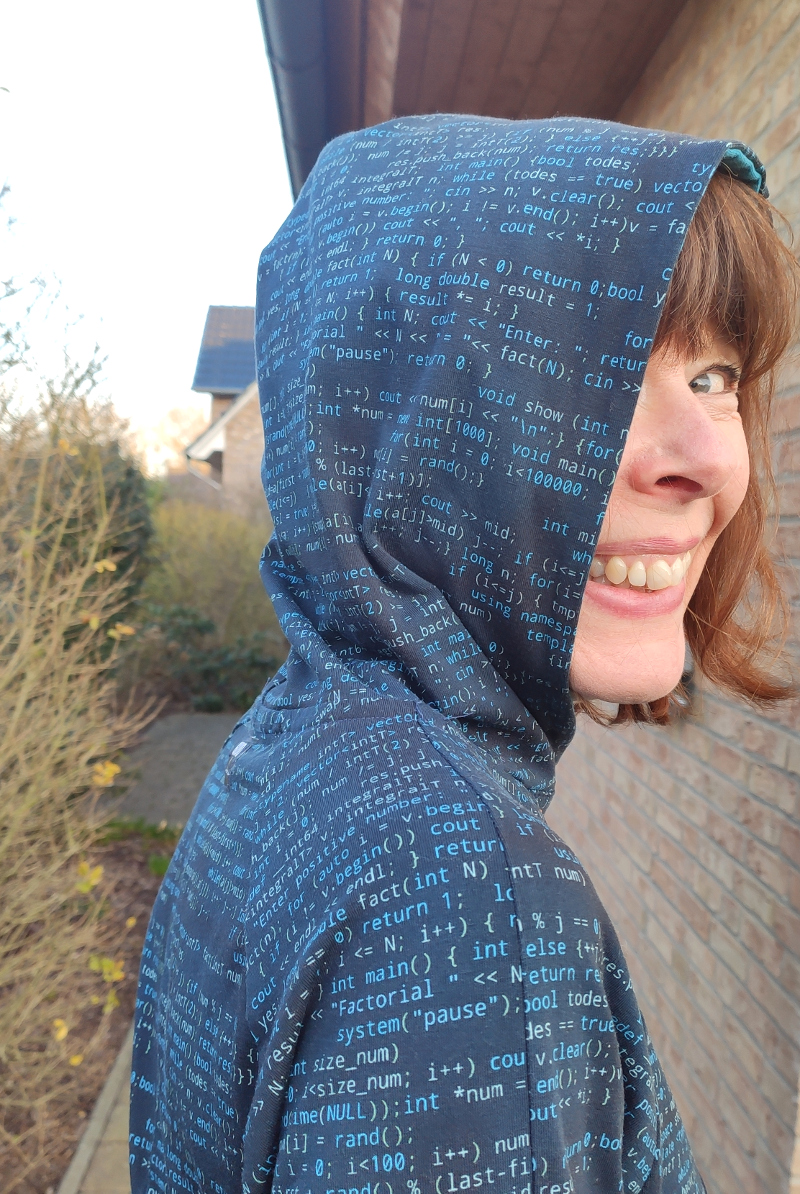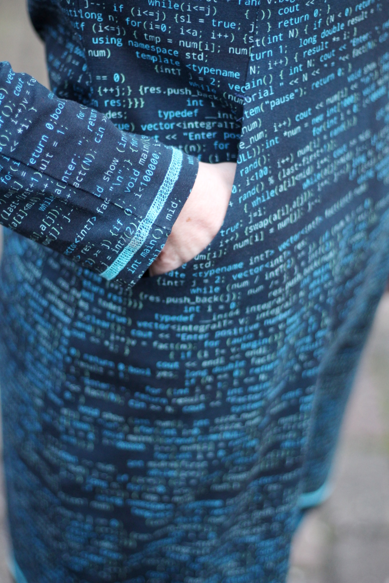 Ausgangspunkt dieses Kleides war ein Besuch im Stoffladen in Wernigerode im letzten Jahr. Ich hatte so ein paar Ideen bezüglich Schnittmuster, aber das sie in meinem Kopf kamen und gingen, war noch nicht das Ende der Fahnenstange erreicht. Als Pattydoo dann das Sweatkleid Jade herausbrachte, wusste ich, YES, das ist mein Schnitt für den bereits gut abgelagerten Jerseystoff. Apropos Stoff, der ist mir gleich ins Auge gesprungen, weil darauf ein Softwarecode gedruckt war. Da ich in einer Firma arbeite, die medizinische Software entwickelt, fand ich den Stoff besonders passend. Ein Kollege aus der Entwicklungsabteilung hat mich sogar gefragt, ob ich das Team wechseln will. Das habe ich lachend abgelehnt. Ne, ich bleib dann doch lieber bei meinen Kunden aus aller Welt als nach streng logischen Programmcodes Software zum Laufen zu bringen und dann auch noch die ganze Dokumentation. Nein, das ist nichts für Mutters Tochter. Starrt man doch schon genug auf den Bildschirm würde sich das beim Programmieren noch potenzieren. Ne, alles gut so wie es ist. Jetzt aber genug geplaudert, ich will euch nicht länger auf die Folter spannen und euch mein neues „Arbeitskleid“ zeigen.