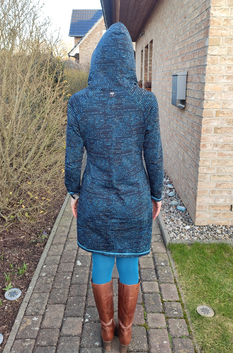 Den Schnitt kann man auch ohne Kapuze nähen. Da ich ihn trotz figurnaher Shilouette super bequem finde, könnte ich hier zur Wiederholungstäterin werden. Gerade die Raglanärmel bringen Bewegungfreiheit und das gute Gefühl. Ich habe die Größe 38 genäht und die Ärmel 3 cm länger gemacht. Ansonsten habe ich keine Änderungen vorgenommen.