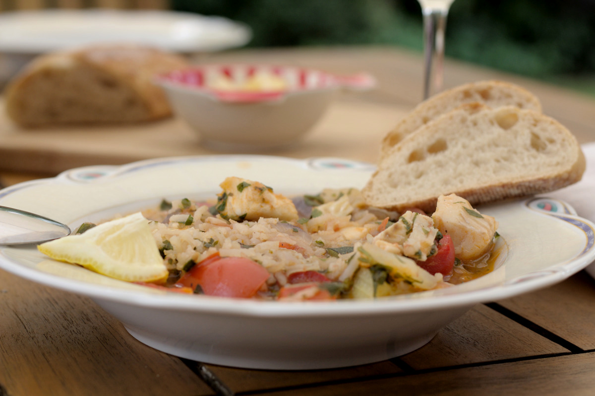 Dieses leichte Sommergericht besticht durch feine Gemüsezutaten, Fischfilet und mediterranen Kräutern. Fenchel, Paprika, Zucchini zusammen mit Zwiebeln, Knoblauch und Tomaten bilden die Grundlage für eine köstliche Soße, in der der Fisch leise vor sich hin simmt. Zusammen mit Reis, Kräutern der Provence und einem Schuß Weißwein wird aus dem One-Pot Gericht ein echtes Sonntagsessen. Also schenk den Rebensaft schon einmal ein. Der Fischtopf zaubert sich bei einem Küchenwein ganz entspannt und ehe du dich versiehst, ist die er auf dem Tisch und die Familie / Gäste können zusammen mit einem Stück Baguette südfranzösische Lebensart genießen.