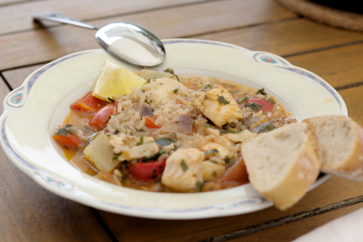 7. Den südfranzöischen Fischtopf in tiefen Tellern servieren. Du kannst ihn mit frisch gehackten Kräutern – glatte Petersilie geht immer – und Zitronenspalten garnieren.