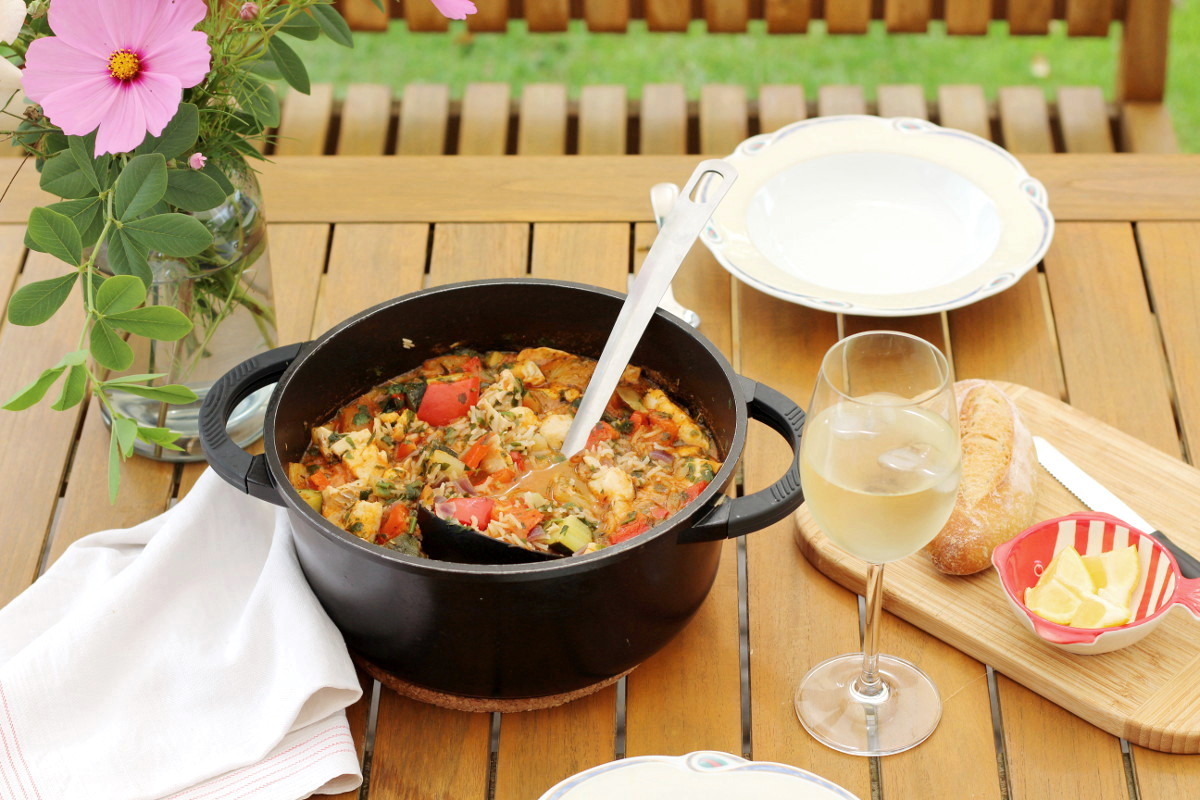 Dieses leichte Sommergericht besticht durch feine Gemüsezutaten, Fischfilet und mediterranen Kräutern. Fenchel, Paprika, Zucchini zusammen mit Zwiebeln, Knoblauch und Tomaten bilden die Grundlage für eine köstliche Soße, in der der Fisch leise vor sich hin simmt. Zusammen mit Reis, Kräutern der Provence und einem Schuß Weißwein wird aus dem One-Pot Gericht ein echtes Sonntagsessen. Also schenk den Rebensaft schon einmal ein. Der Fischtopf zaubert sich bei einem Küchenwein ganz entspannt und ehe du dich versiehst, ist die er auf dem Tisch und die Familie / Gäste können zusammen mit einem Stück Baguette südfranzösische Lebensart genießen.