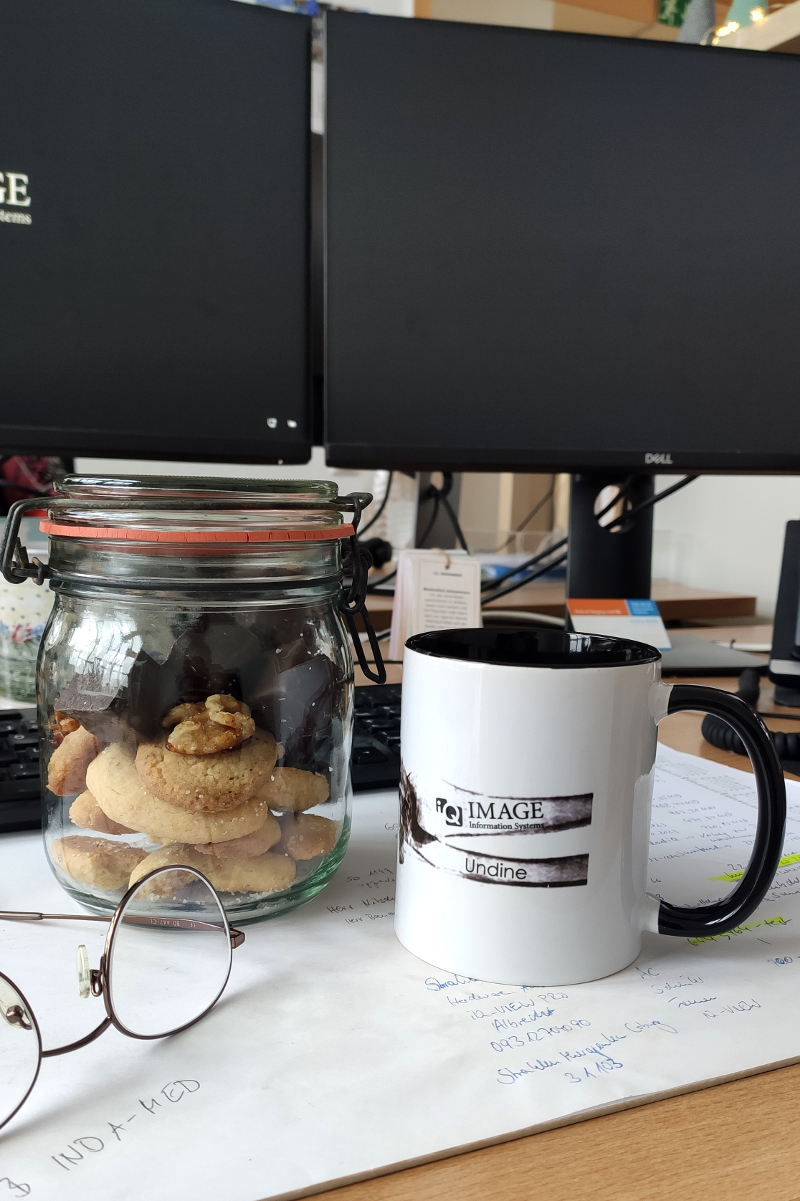 Davor aber noch schnell einen Kaffee gezogen und mit ein paar leckeren Keksen vertilgt. Das gibt Energie und hilft aus dem Mittagstief. Bei uns hat übrigens jeder eine Namenstasse. Sehr praktisch, wenn wieder ein einsamer Kaffee am Automaten geblieben ist. Ein paar Mails, Telefonate und Excel-Tabellen weiter war schon wieder Feierabendzeit. Wie schnell doch immer so ein Arbeitstag vorbei ist. Dann wieder ab aufs Fahrrad. Was ich am Dezember mag, ist der Weihnachtsmarkt, an dem ich jeden Tag vorbeifahre. Es duftet nach Glühwein, Bratwurst und Mutzen. Die Lichter tun gut in der dunklen Jahreszeit.