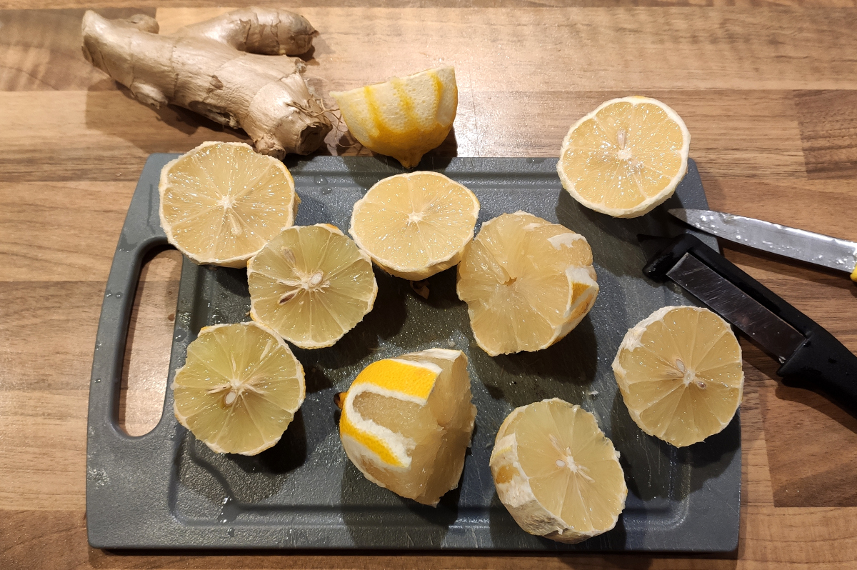 Zuhause angekommen, habe ich eine neue Flasche Ingwer-Zitronenshot gekocht. Seit der Junior beim Studium ist, muss ich das selber übernehmen. Hab es schon schwer, nicht? :-)