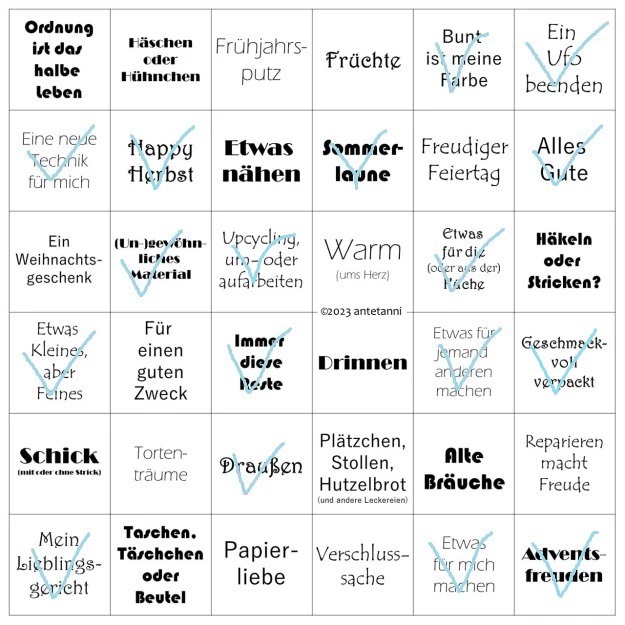 Ganz herzlich möchte ich mich auch bei meinen beiden Mitorganisatorinnen Starky und Marietta bedanken. Die beiden haben mindestens genauso viel Aufwand mit dem Koordinieren, Umpacken und Abschicken der Pakete in ihren beiden Gruppen. Ich hoffe, auch in euren Adventssonntagspäckchen konntet ihr tolle Geschenke auspacken. Verlinkt mit Antetannis Jahresbingo mit dem Kästchen „Geschmackvoll verpackt“, weil die Geschenke vom DNAS2023 so nachhaltig und toll verpackt waren.
