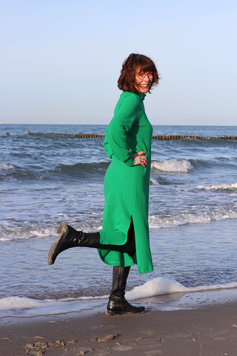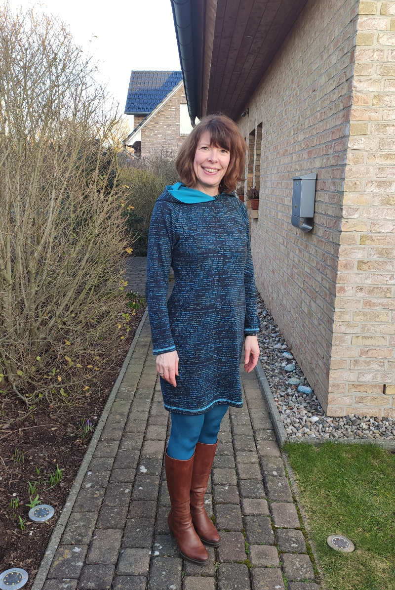 Ich bin auch im letzten Jahr meiner Kleiderliebe treu geblieben und habe ein paar Neuzugänge zu vermelden. Gleich im Winter habe ich einen Jersey vernäht, der Programmiercodes aufgedruckt hat. Unser technischer Leiter hat mich schon gefragt, ob ich die Abteilung wechseln möchte, wenn ich das Kleid anhabe. Ne, das lassen wir doch lieber. Ich und programmieren? No, way. Ich bleib lieber bei der Kundenbetreuung. Mit Menschen zu reden ist mir auch im modernen Zeitalter lieber als Programmiersprachen. Deswegen werde ich auch weiterhin meine Beiträge schreiben und das nicht ChatGPT überlassen. Ich bin da etwas hochnäsig und behaupte, dass ich das immer noch lebendiger und besser kann als die künstliche Intelligenz. Vielleicht darf das Programm mir mal eine Überschrift vorschlagen, aber das solls auch gewesen sein. Der Vollständigkeit halber und um wieder zum Nähen zurückzukommen: das Kleid ist eine Jade von Pattydoo, dessen Schnitte immer sehr durchdacht und etwas Besonderes sind.