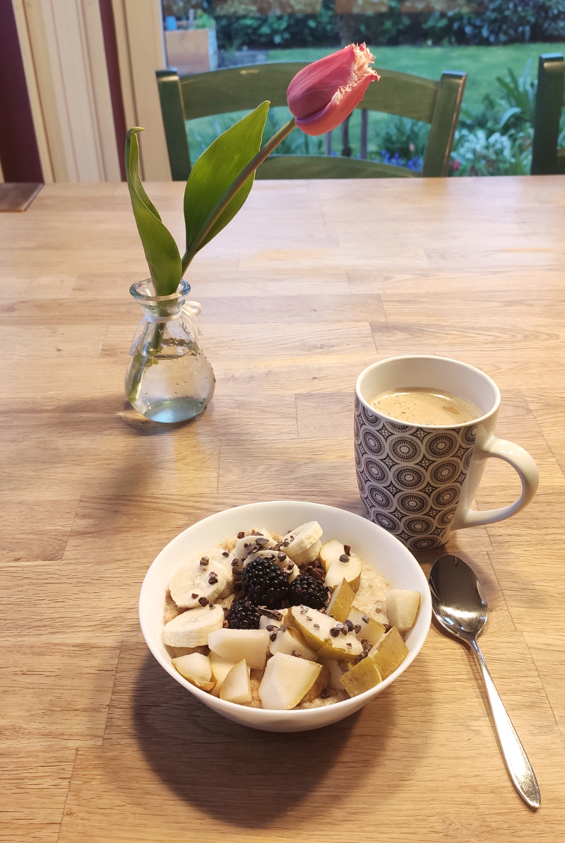 Oh je, nicht so super geschlafen und zu früh ist es auch noch. Erst einmal ein Kerzchen an und ab auf die Yogamatte. Ihr hättet nicht sehen wollen, wie ich mich schon in der Haltung des Kindes gequält habe. Danach ging es aber besser und das geliebte Porridge mit Kaffee hat gerichtet, was zu richten war.