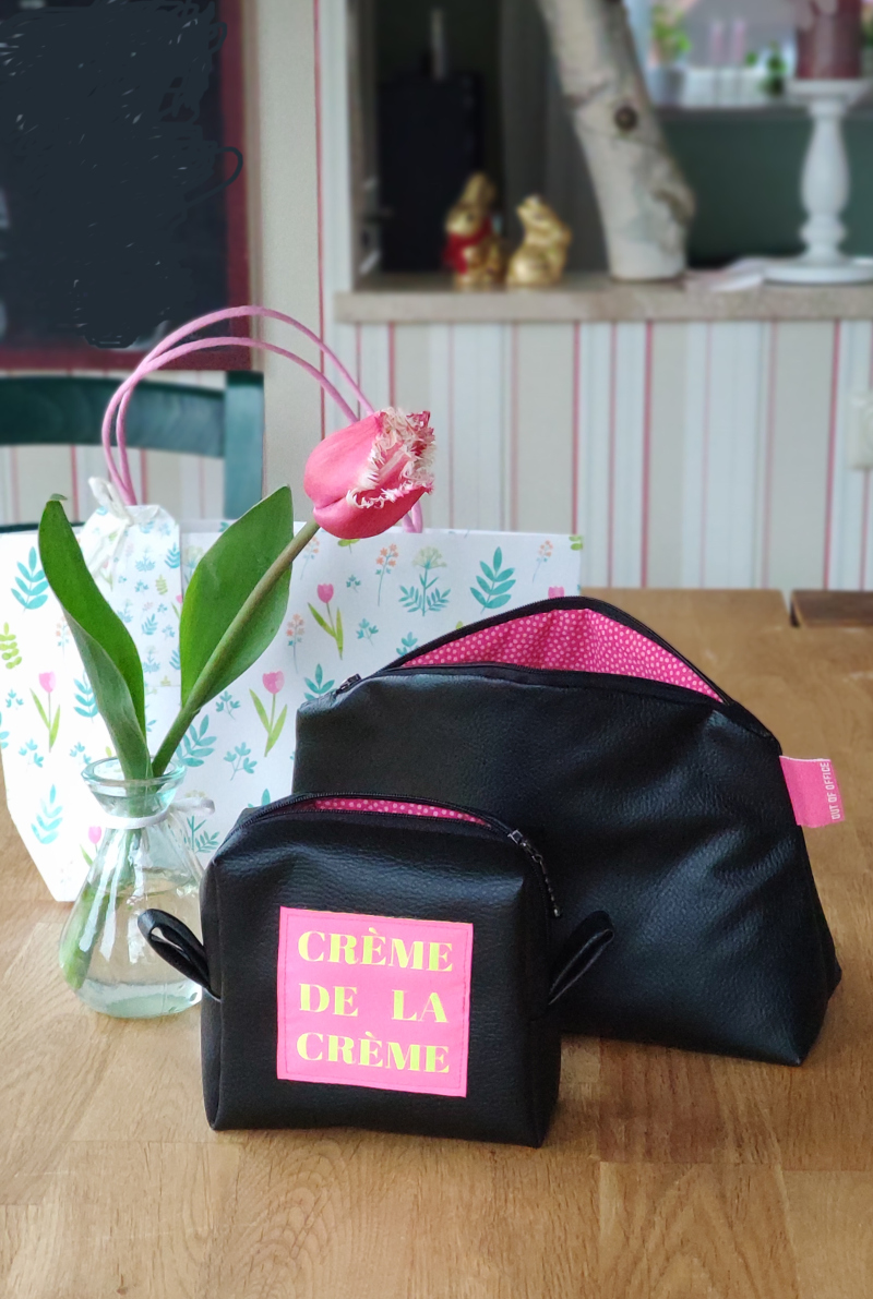 Dann noch schnell ein Geschenk fotografiert und in eine Tüte gepackt. Ich gebe zu, beim Einpacken bin ich nicht so kreativ. Ich finde auch, dass das Geschenk sowieso gleich ausgepackt wird und daher lege ich eher Wert auf den Inhalt als auf die Verpackung. Da bin ich sehr (leider) pragmatisch. Ich habe eine Tiffy genäht und eine Quarterbag von Its a patch. Natürlich in den Lieblingsfarben meiner Kollegin: Schwarz und Pink.