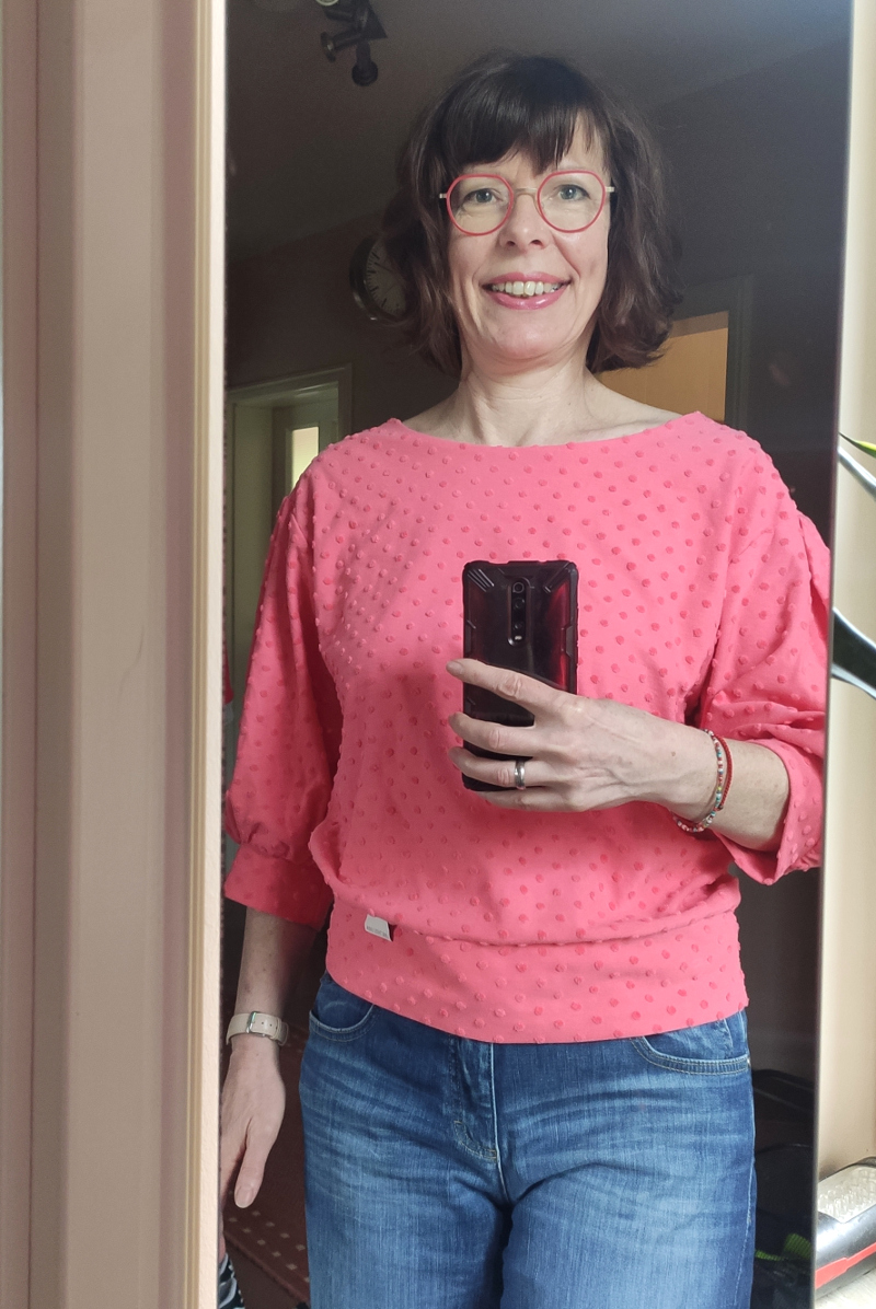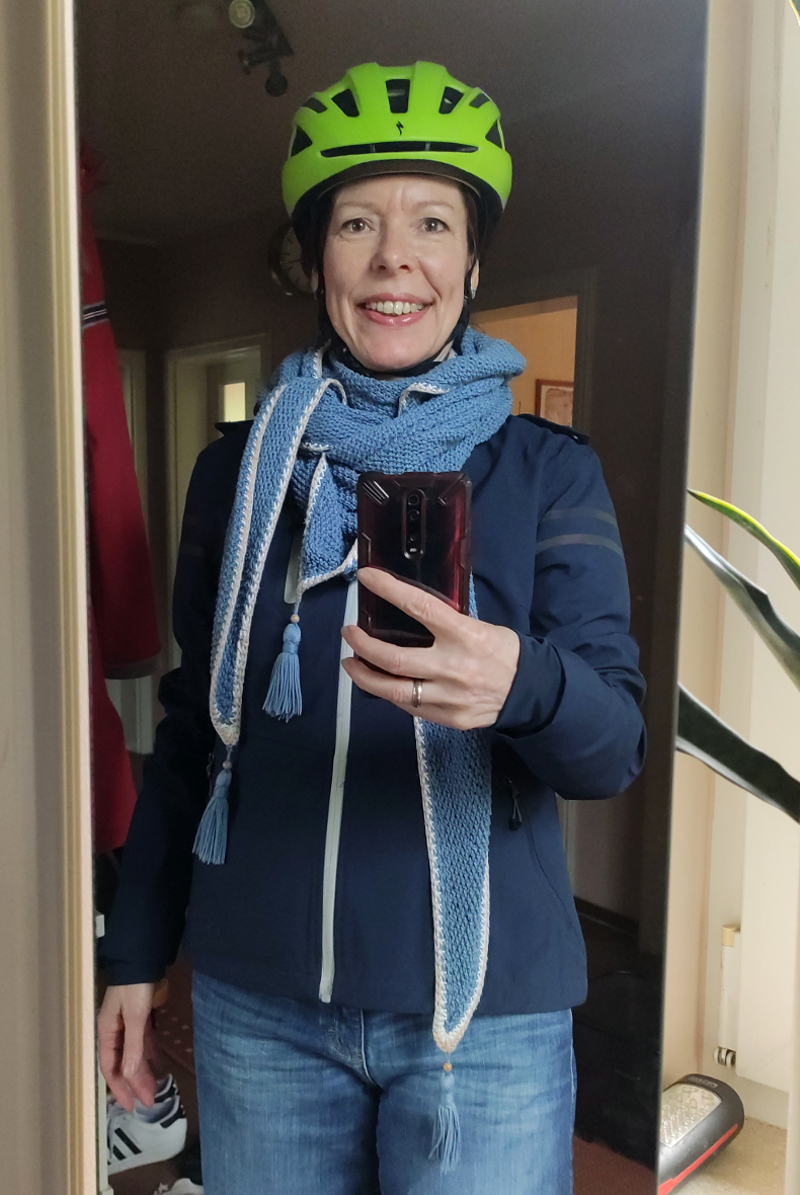 Dann noch die Metamorphose vom Bürolook zum Fahrradfahrer. Ich trage die Fibremood Arielle, die ich schon allein wegen der Farbe im Frühling sehr gern mag. Passt zu Jeans und meiner Brille, check! Dann Brille ab, weil Helm und Brille zusammen unbequem sind, Jacke an, Tuch um und rauf aufs Fahrrad. Auch wenn die Helmfrisur hinterher nicht mehr ganz so fein ist, trage ich ihn seit Januar konsequent. Mir ist da meine Sicherheit wichtiger. Das kommt wohl mit dem Alter, früher bin ich freihändig Fahrrad gefahren.