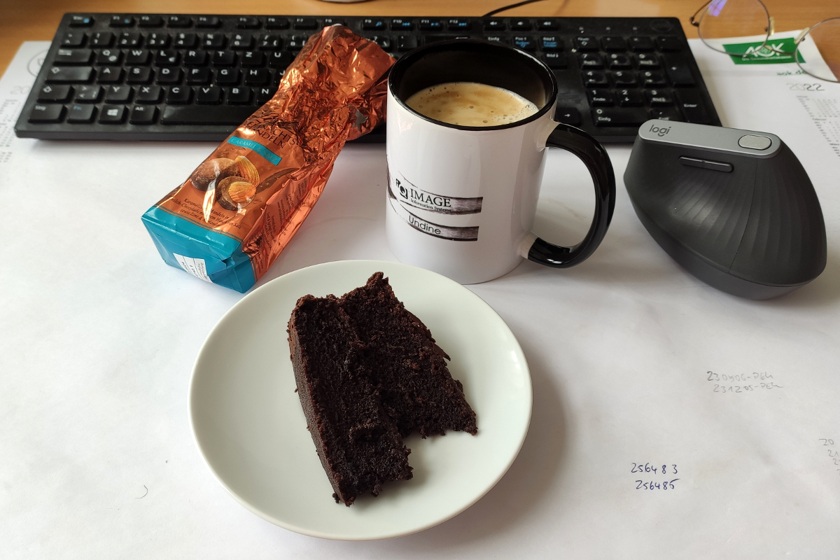 Auf Arbeit angekommen, vergesse ich ganz schnell alles andere. Daher auch kein Mittagsfoto, war aber auch nicht so spektakulär, aber ganz ok. Es gab Nudeln mit Kräuter-Schmand-Soße aus dem Kröpikeller (Kantine). Hinterher noch ein Geburtstagskuchen von einem Kollegen. Habe ich noch im Kühlschrank gefunden und war noch sehr lecker. Habe ich schon erwähnt, dass es bei uns ständig Kuchen gibt? Jeden Donnerstag von der Chefin selbst gebacken und dann die vielen Geburtstagskuchen. Jetzt im März / April war es echt extrem. Da hinke ich dann hinterher mit meinen Süßigkeiten aus der Schreibtischschokolade. Hier vertilge ich noch ein paar Weihnachtsmandeln. Na ja, Ostern ist ja auch gerade erst vorbei!