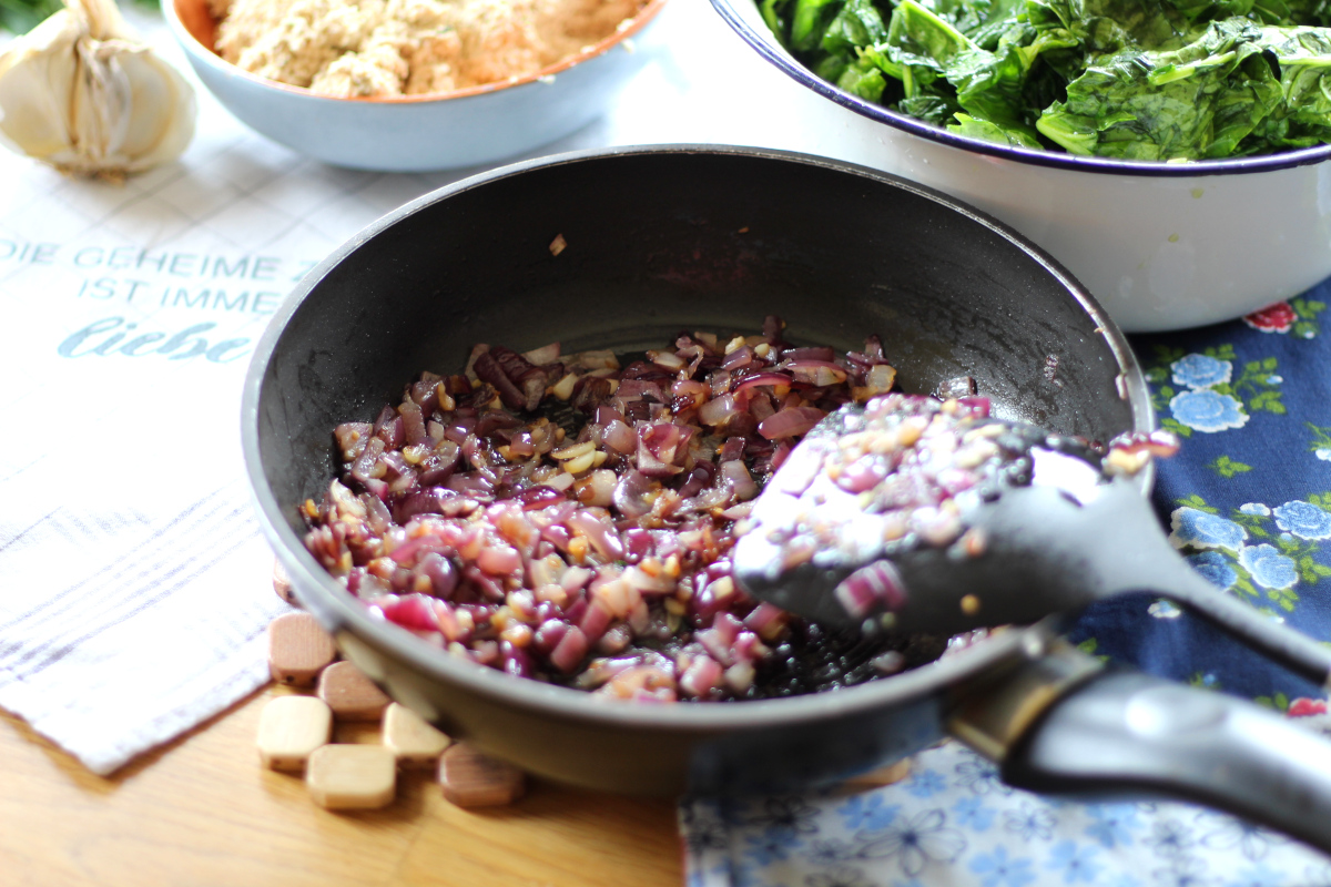 2. Zwiebeln und Knoblauch schälen, fein würfeln und in dem Olivenöl goldbraun anbraten. Das gibt ein feines Aroma.