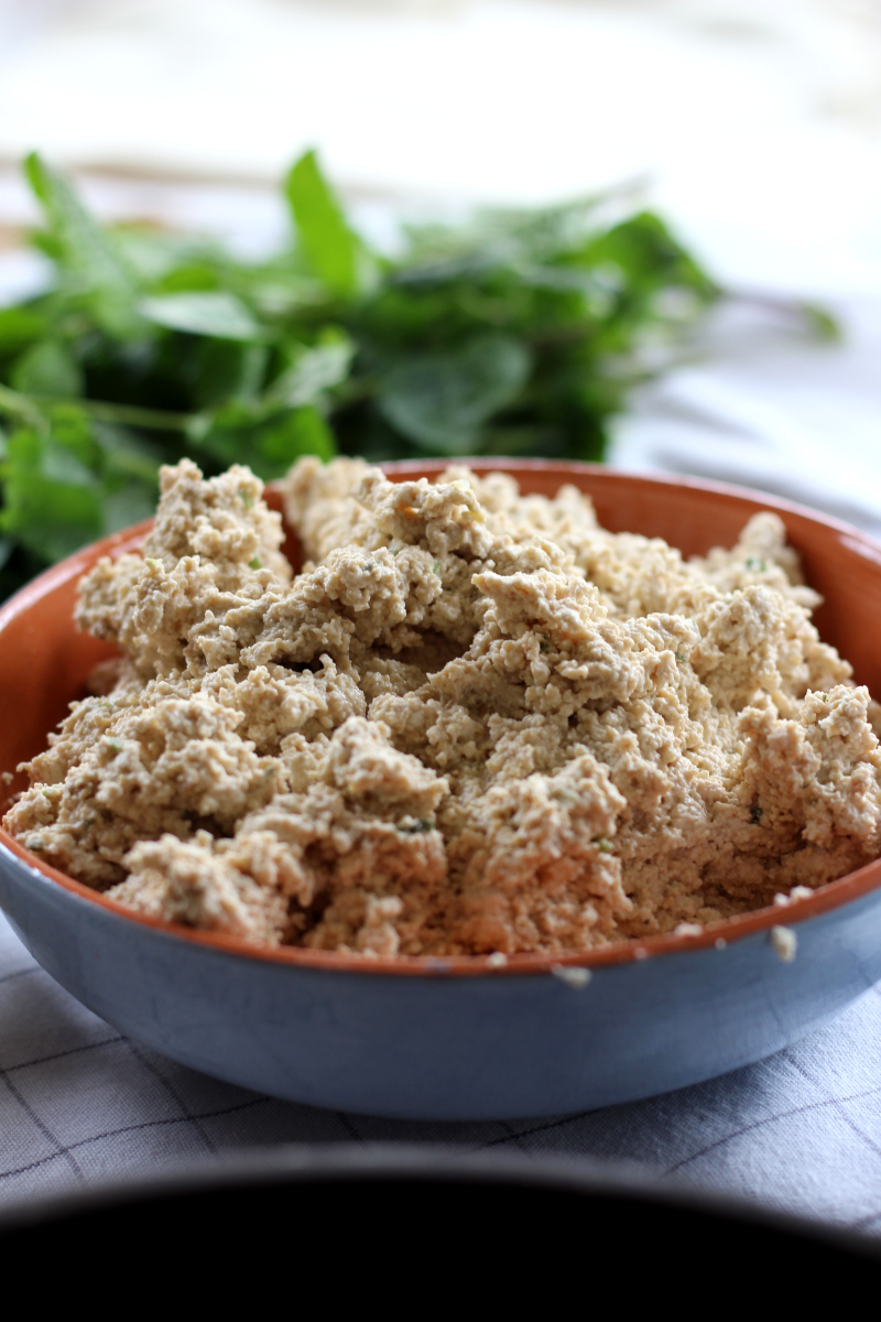 3. Den Tofu fein bröseln, mit veganen Frischkäse, Hefeflocken, Kichererbsenmehl (optional), Zitronensaft, 2 EL veganer Milch, Muskat und Pfeffer vermischen. Das ist der Schafskäsersatz und er ist sehr ebenbürtig durch die Hefeflocken und die restlichen Gewürze. Hier kann man sicherlich auch veganen Schafskäse aus dem Handel nehmen, aber ich finde es mit Naturtofu noch natürlicher.