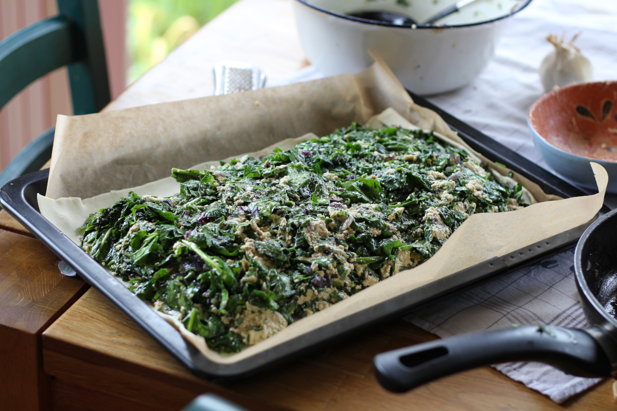 5. Auf ein Backblech jetzt einen Blätterteig ausrollen, am besten auf Backpapier. Spinat, Zwiebeln und Tofugemisch miteinander vermengen (größere Schüssel ist praktisch) und auf dem Blätterteig verteilen. Dabei einen Rand von ca. 2 cm lassen, damit man den 2. Blätterteig dort mit dem Boden verbinden kann. Ich habe leider nur ein Bild gemacht von dem ersten Blätterteig mit Füllung. Ist schon ein bisschen mit Berg, aber es funktionierte trotzdem gut, den Deckel auf die Spanakopita draufzulegen, um Deckel und Boden zu einem Päckchen zu packen. Mit einer Gabel den Rand festdrücken und oben ein paar Luftlöcher mit der Gabel einpieken, damit der Dampf entweichen kann.