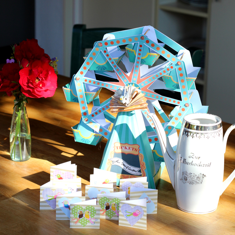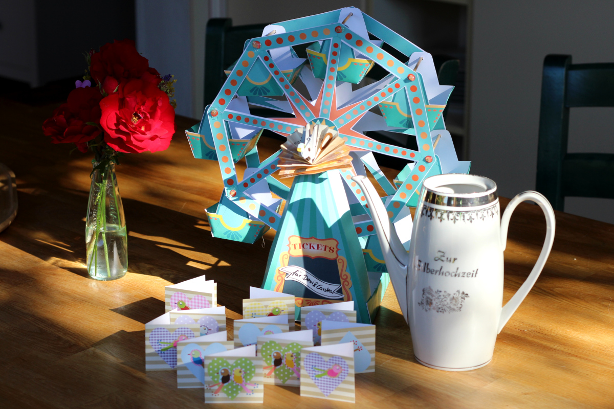 Neben einem Wellnessgutschein gab es noch Geld für ein Dinner im Riesenrad. Mit Blick auf die Ostsee kann man in Kühlungsborn in MeinRad frühstücken oder zu Abend essen. Es gibt auch einen Heiratsantrags-Service, aber den brauchen unsere Freunde ja nicht mehr. Da kommen sie 25 Jahre und paar Tag zu spät. Die Idee mit dem Frühstück oder Abendessen in einem Riesenrad hat uns aber gut gefallen, weil es schon eher etwas Besonderes ist. Für die Verpackung hatten wir an eine Popup-Karte gedacht. So etwas richtig Schönes habe ich aber nicht gefunden bis ich auf Etsy bei HoplaLAB dieses tolle Riesenrad zum Ausdrucken gefunden habe. Da war es um mich geschehen. Das wollte ich haben. Ich gebe zu, dass das schon ein wenig aufwendig war, aber das Auschneiden war meditativ und das Zusammenkleben hat super geklappt. Die Anleitung war verständlich und auch wenn es nicht perfekt war, war es ein Hingucker. Das Geld habe ich dann gefaltet und in der Achse rechts und links mit Klammern befestigt, wo ein Täubchen drauf war. Sieht man im Licht- und Schattenspiel am morgendlichen Küchentisch leider nicht so richtig.