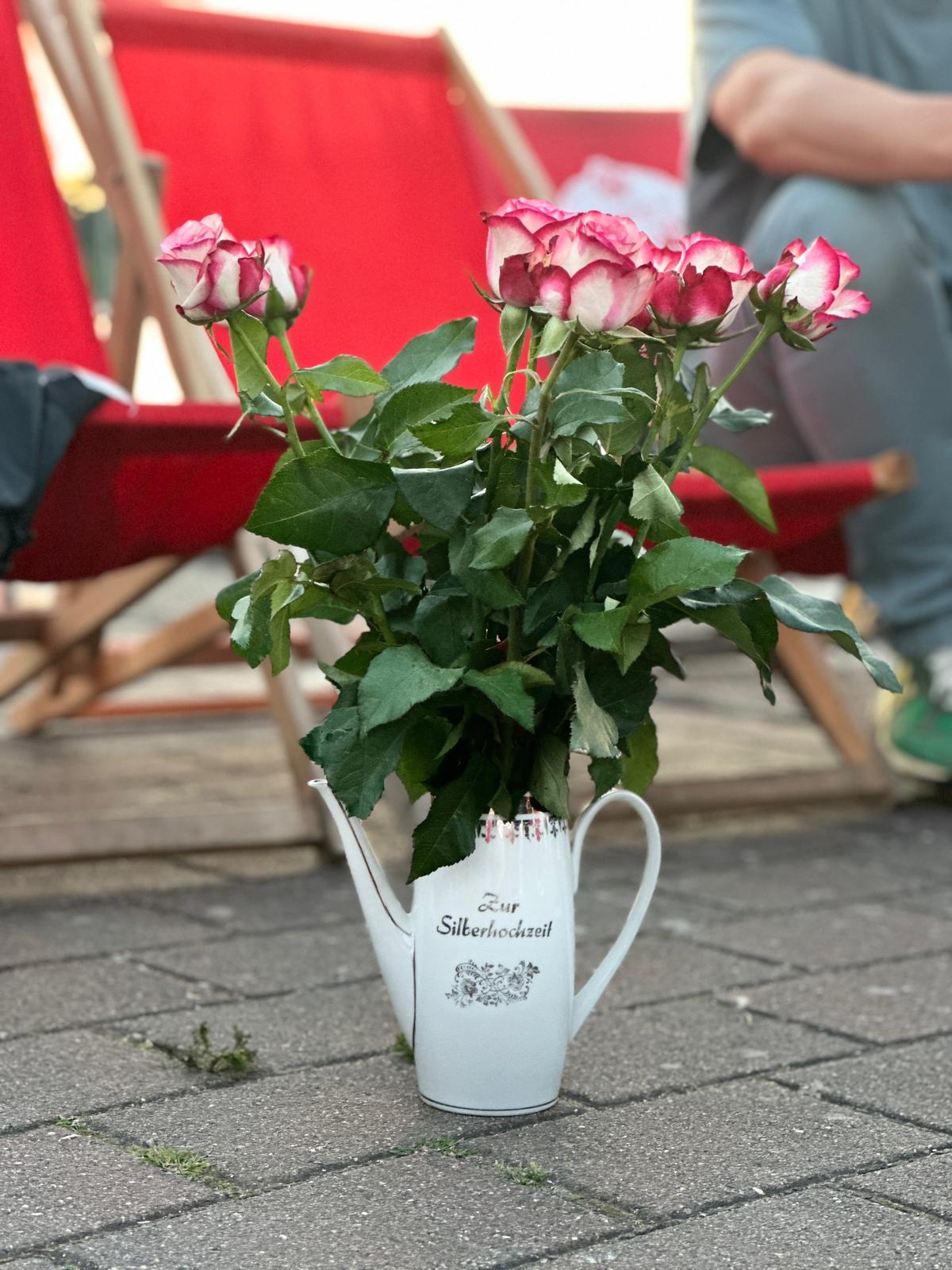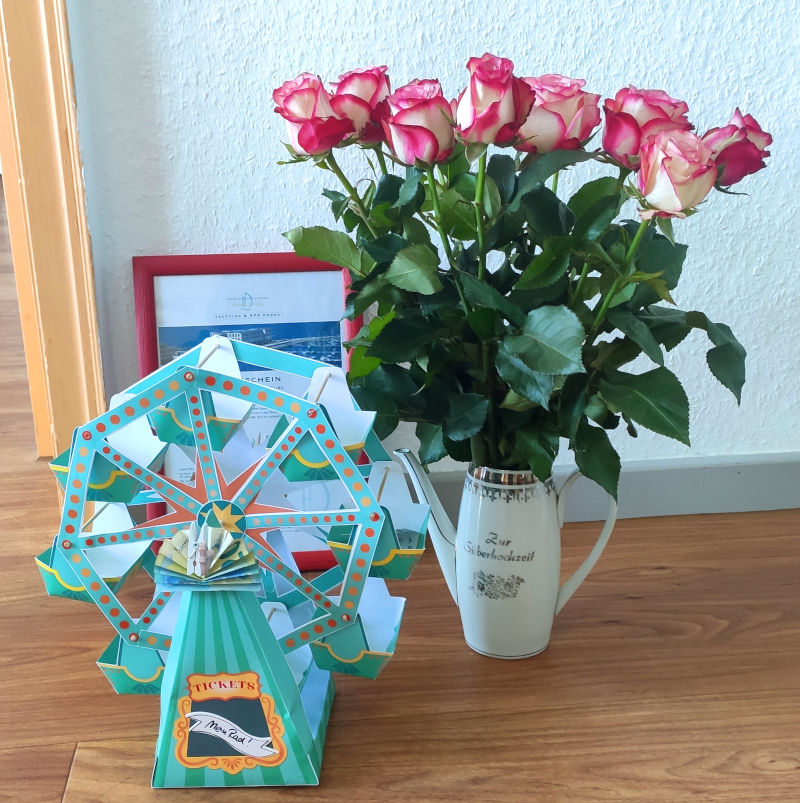 In die Blumenvase vom Flohmarkt haben wir noch Rosen gesteckt und mit Riesenrad und Wellnessgutschein im Bilderrahmen verschenkt. Während wir noch am Stadthafen bei einem Absacker saßen, stand der Blumenstrauß in unserer Mitte. Es war ein toller Abend unter Freunden und er war die Augenringe am nächsten Morgen tausendprozentig wert. Silberhochzeit fällt ja immer auf einen Wochentag, wenn man klassisch am Wochenende geheiratet hat.