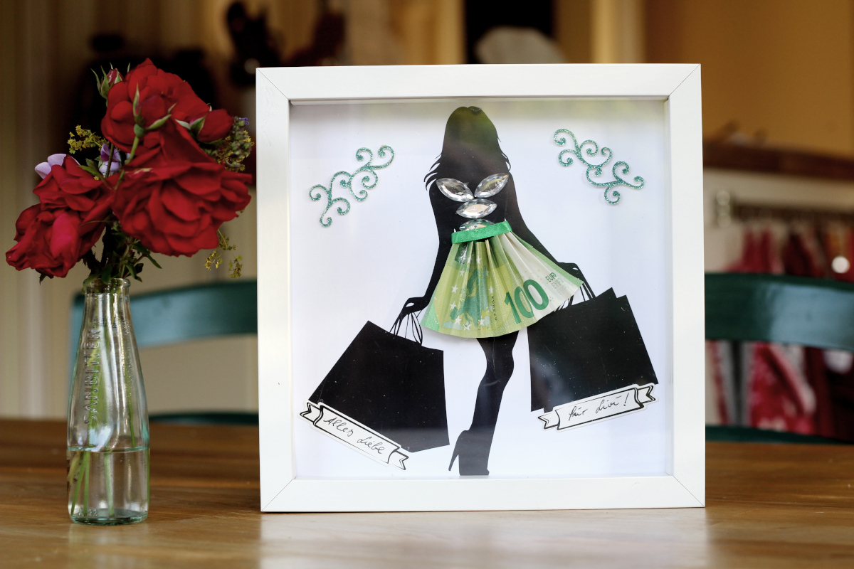 Ich habe die Silhouette des Shopping Girls bei Veectezy gefunden. Da gibt es viele Bilder for free und bestimmt isst auch etwas für dich dabei, falls du für ein ähnliches Thema ein Geldgeschenk verbasteln willst. Der Hunni wurde zum Faltenrock gestaltet und an die Einkaufstaschen kam noch ein persönlicher Gruß. Wie gesagt, alles aus dem Fundus und glaubt mir, ich könnte damit noch so einige Geschenke verzieren. Ich mags, dass ich sozusagen aus dem Stand etwas fertig machen kann.