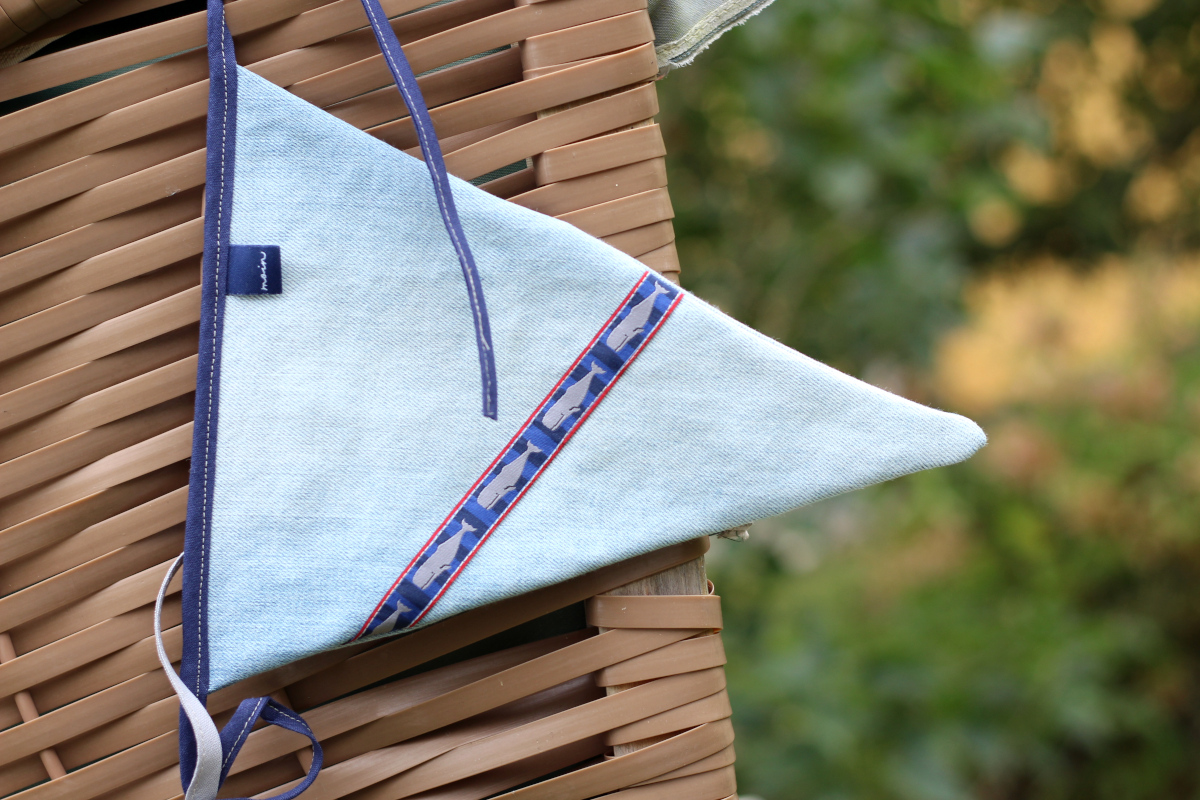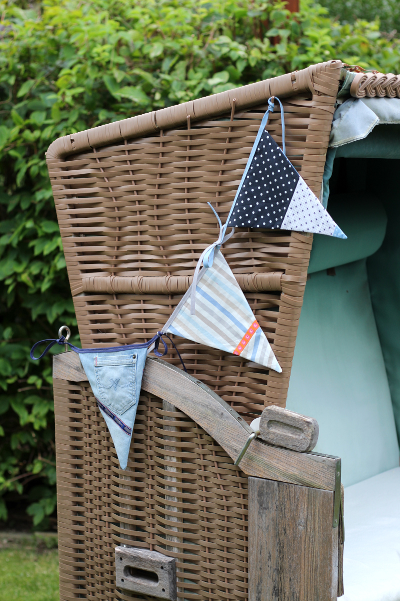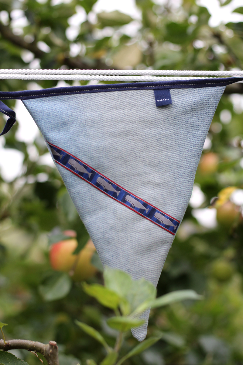 Ich habe fleißig in meiner Restekiste gewühlt und ein paar blaue Stoffschnipsel verwendet. So ist das Patchworkstreifen-Exemplar entstanden. Aus meiner alten Lieblingsjeans habe ich einen weiteren Wimpel genäht und auf der Rückseite einen Ausschnitt mit einer Potasche verwendet. Ich finde den Gedanken ganz charmant, dass meine alte Jeans noch etwas von der Welt sieht.