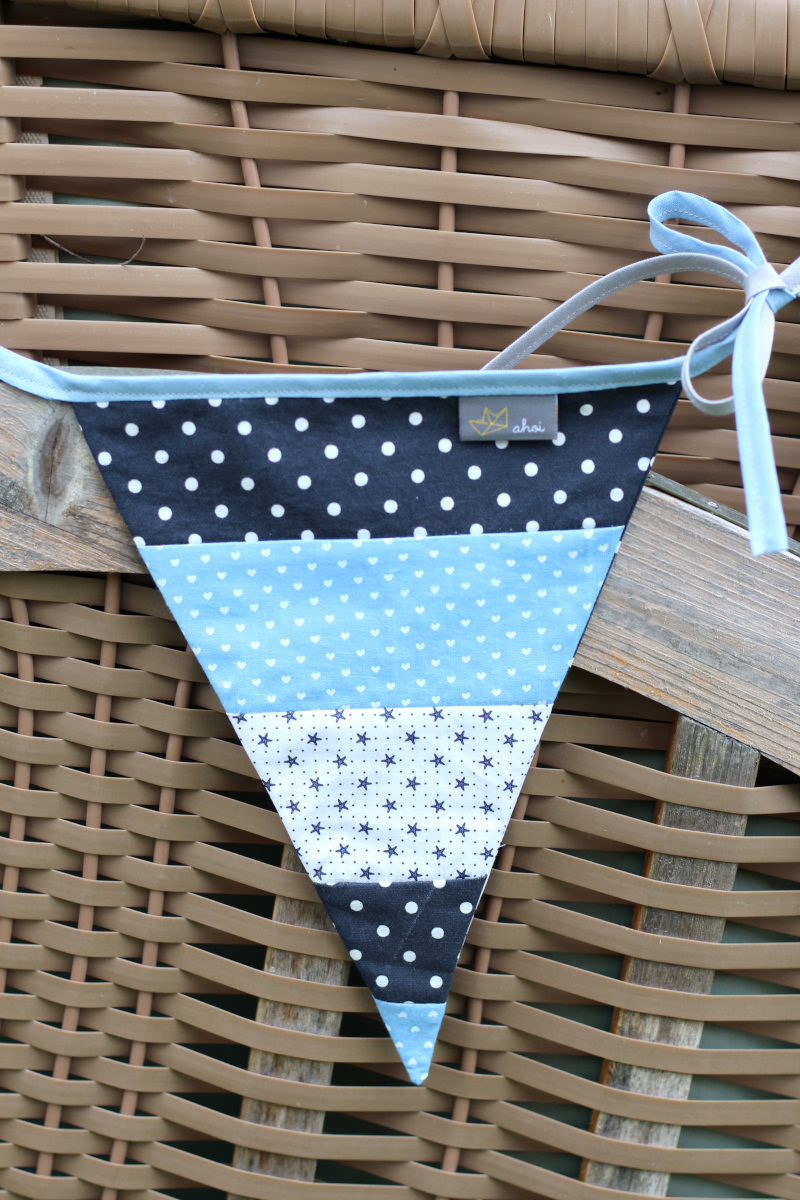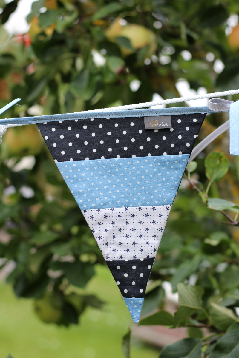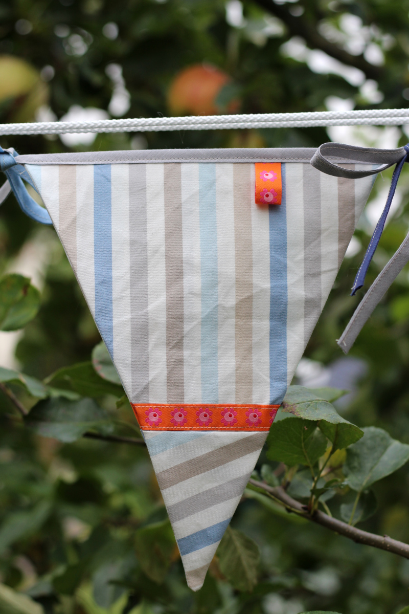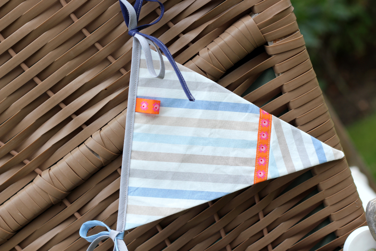 Für den dritten Wimpel habe ich einen maritimen Streifenstoff verwendet, der auch mit etwas Zirkelei gereicht hat. Für die Bänder habe ich Schrägband verwendet und zwei kleine Label sowie buntes, fröhliches Webband vernäht. Von weitem wird man die kleinen Details nicht sehen, aber beim Verknoten und Aufhängen. Vielleicht freut sich derjenige dann ein bisschen darüber.