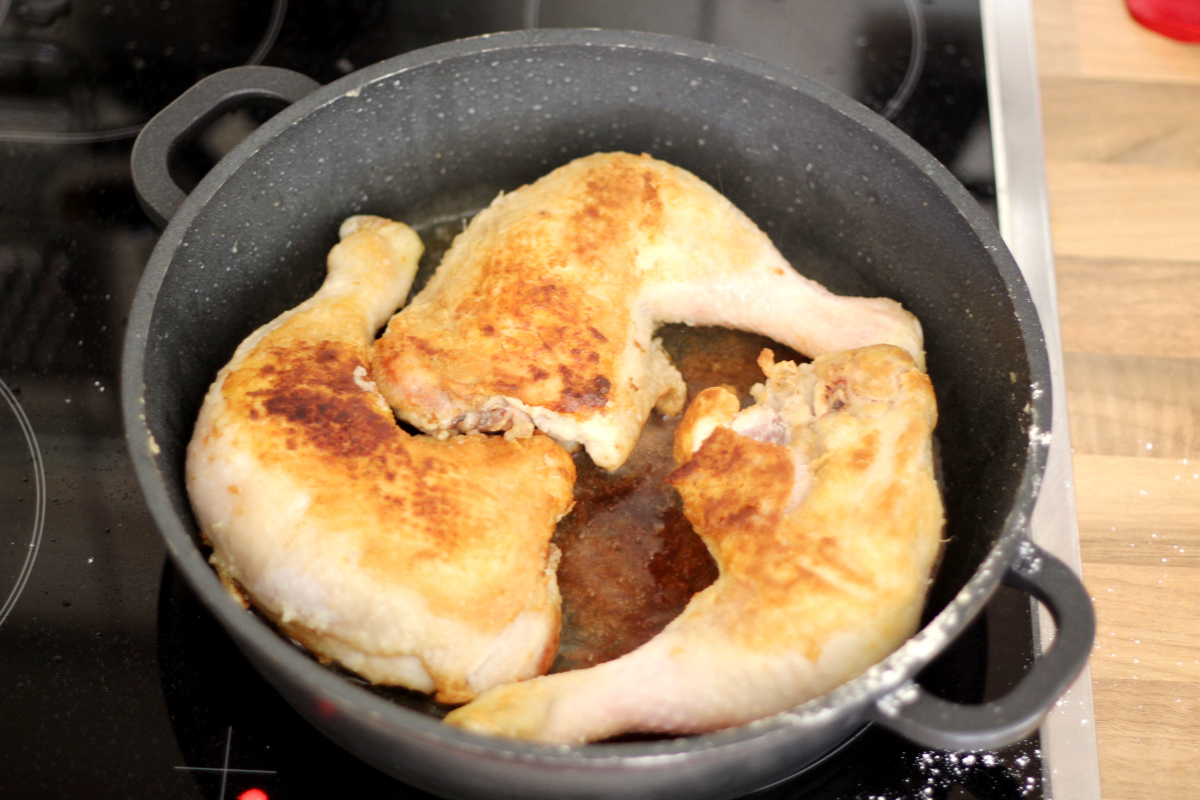 1. Kartoffeln schälen, Möhren schälen und in mundgerechte Stücke schneiden. Die Hähnchenschenkel in dem Mehl wälzen, das Öl in einer Pfanne erhitzen und die Schenkel 5 Minuten anbraten und dabei schön braun werden lassen. Danach aus der Pfanne nehmen.