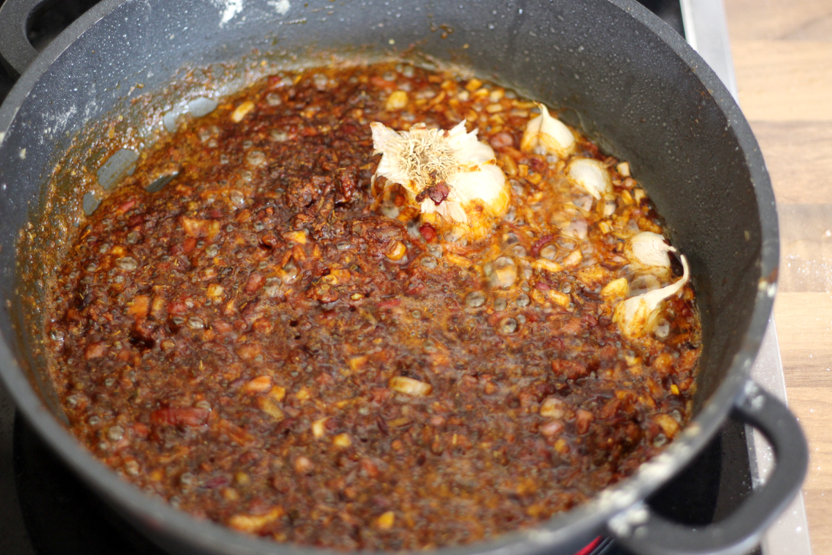 2. Die gepellte Zwiebel würfeln und zusammen mit der Knoblauchknolle mit der Schnittfläche nach unten in das Bratenfett geben und braten. Dazu die Teewurst, den Oregano, die beiden Paprikasorten, die Lorbeerblätter geben und ein paar Minuten sanft braten. Salz und Pfeffer dazu und dann mit dem Weißwein ablöschen und weitere 3-4 Minuten köcheln lassen.