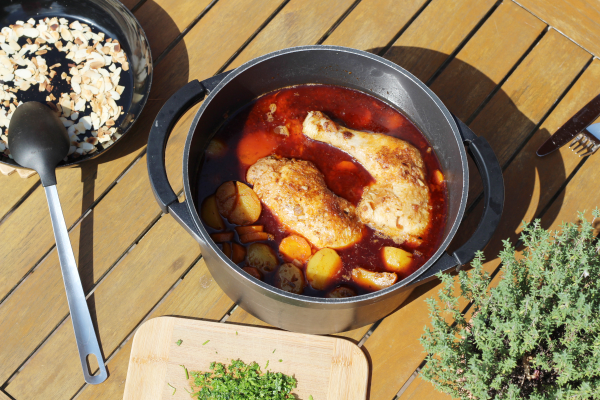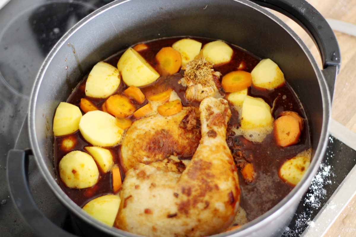 3. Hähnchenkeulen und das Gemüse in den Topf zurückgeben, mit 300 ml Wasser auffüllen und ca. 25 – 30 Minuten bei geschlossenem Deckel kochen bis die Kartoffeln und Möhren gar sind.