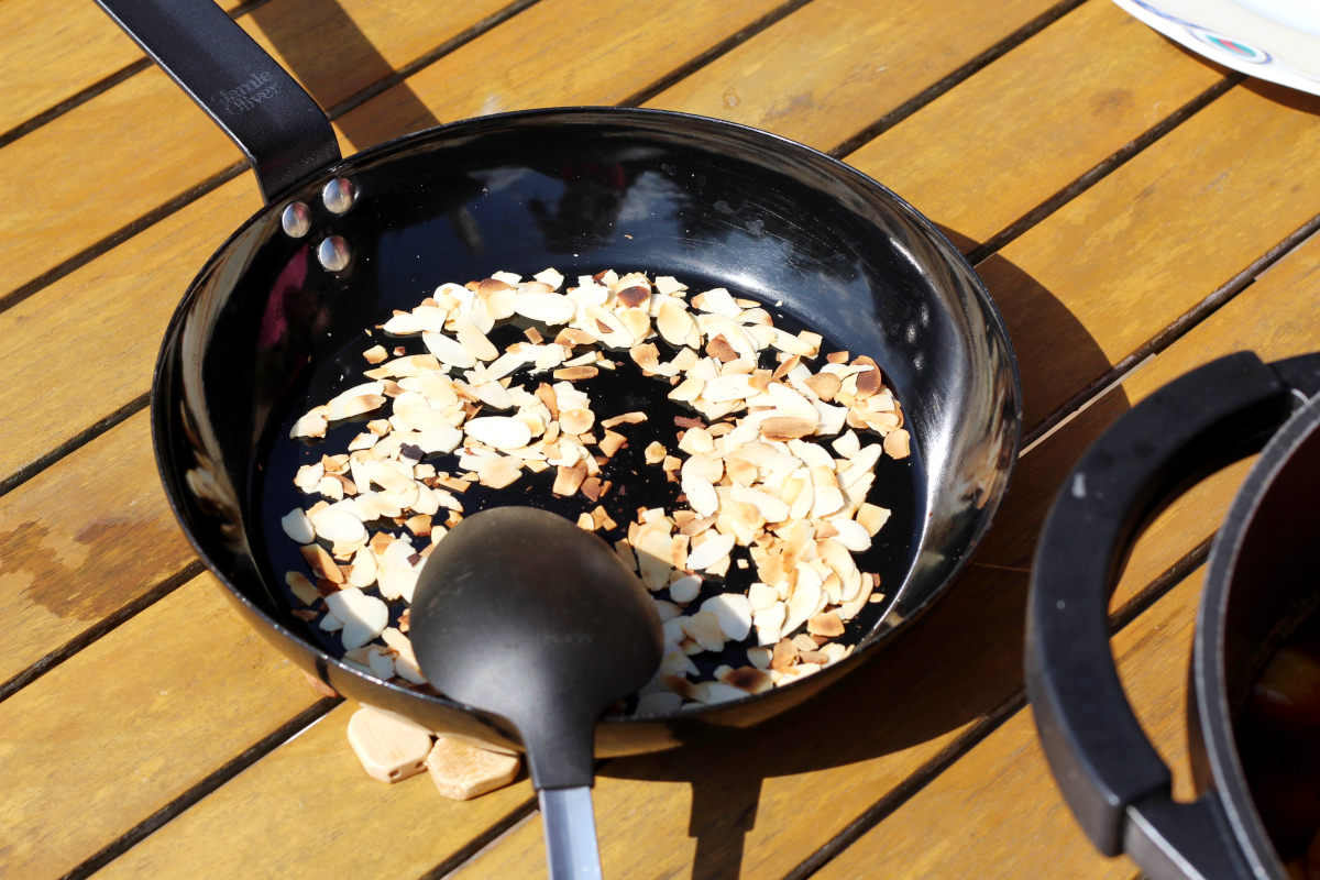 5. Die Mandelblättchen ohne Fett in einer Pfanne rösten und die Petersilie waschen und kleinschneiden. Fertig sind deine geschmorten Hähnchenschenkel mit Kartoffeln, Möhren und Backpflaumen.