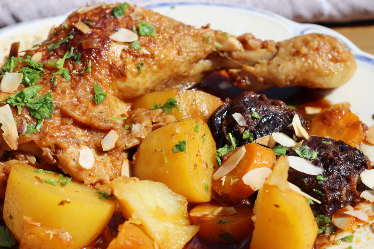 Hähnchen ist immer wieder lecker und warum nicht einmal einen Eintopf mit geschmorten Schenkeln kredenzen, der mit Möhren und Kartoffeln zu einer vollwertigen Mahlzeit wird. Backpflaumen machen ihn zu einer pikanten Angelegenheit. Dazu sei noch erwähnt, dass Teewurst mit edelsüßem Paprika vermischt, ein ordentlicher Schuß Weißwein und eine halbe Knolle sanft geschmorter Knoblauch für den Geschmackskick sorgen. Na? Habe ich dich jetzt? Wenn du dann noch dein Essen mit gerösteten Mandelblättchen und ein wenig gehackter Petersilie toppst, werden deine Tischgenossen dich lieben und deine Kochkunst bewundern. Es ist gar nicht so schwer zuzubereiten, trotzdem ein wenig raffiniert und oberlecker. Hier das Rezept für euch.