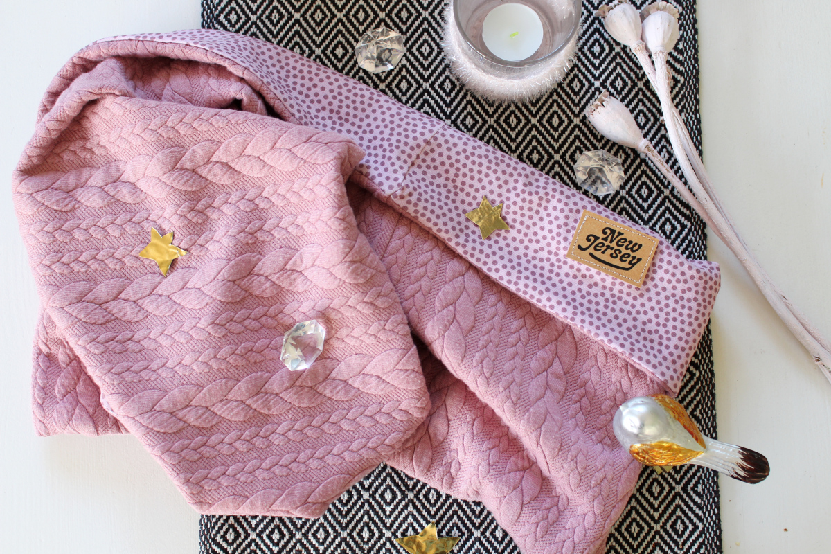 Bei der Farbe habe ich darauf geachtet, dass sie möglichst allen steht und auch hoffentlich gefällt. So ein rosenholzfarbener Ton schmeichelt dem Winterteint und bringt trotzdem ein bisschen Farbe ins Spiel. Ich finde, er hat auch schon etwas Frühlingshaftes. Trotzdem hält er schön warm durch den Strick und ist trotzdem nicht zu dick durch den weichen Jersey.